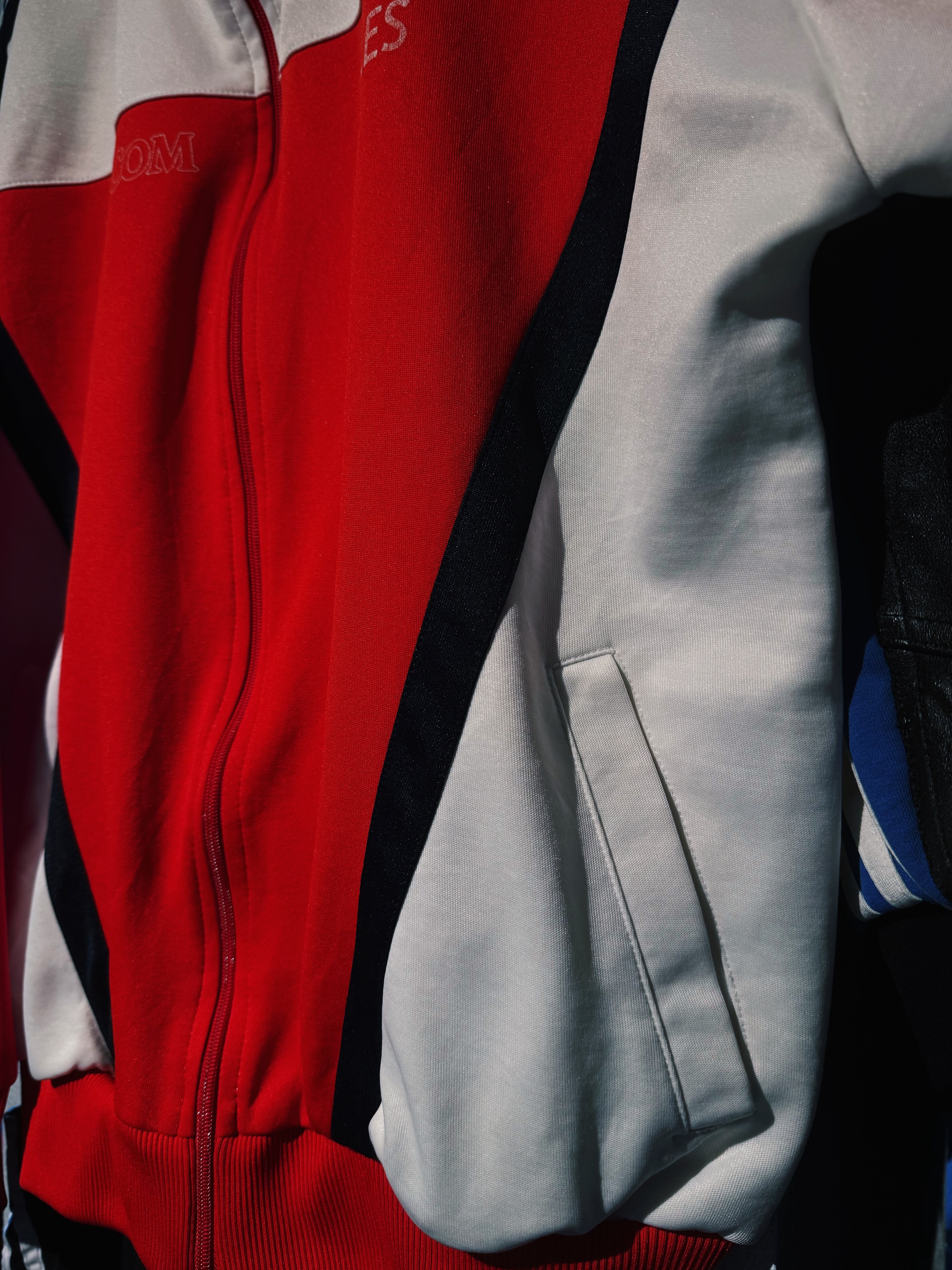 ブラック、ホワイト、レッドの3色ボディでクラシックなデザインとカラーブロックが特徴的な一着