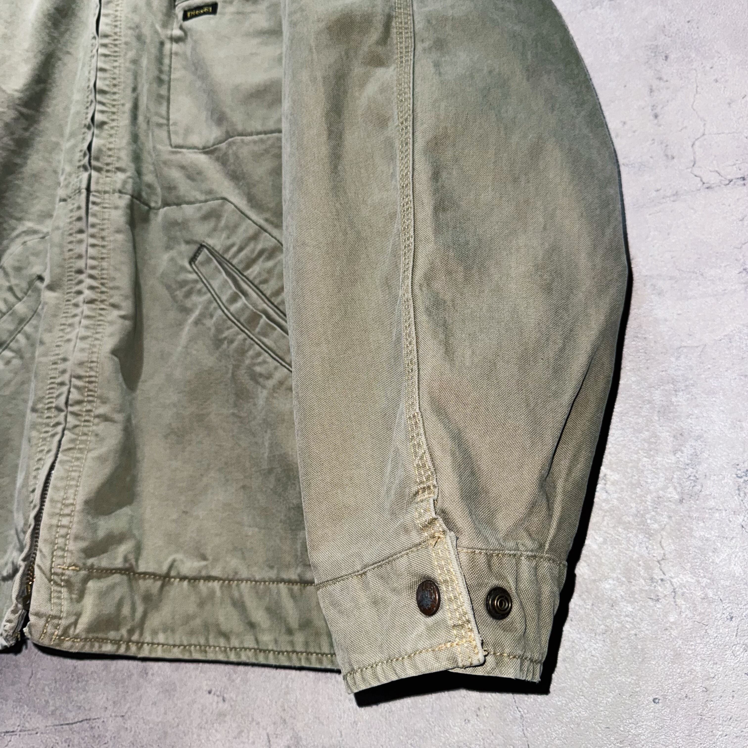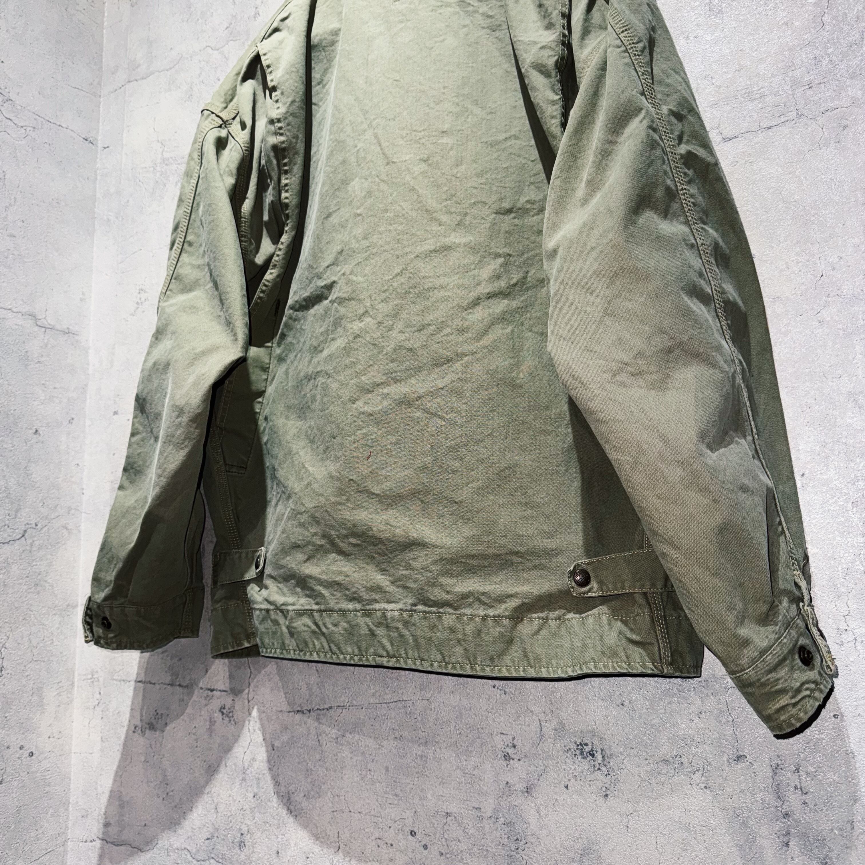 色褪せたヴィンテージらしい風合いを醸し出すカーキカラーを身に纏ったワークジャケット。トラディショナルコートを彷彿させるようなデザインで無骨な仕上がりに。