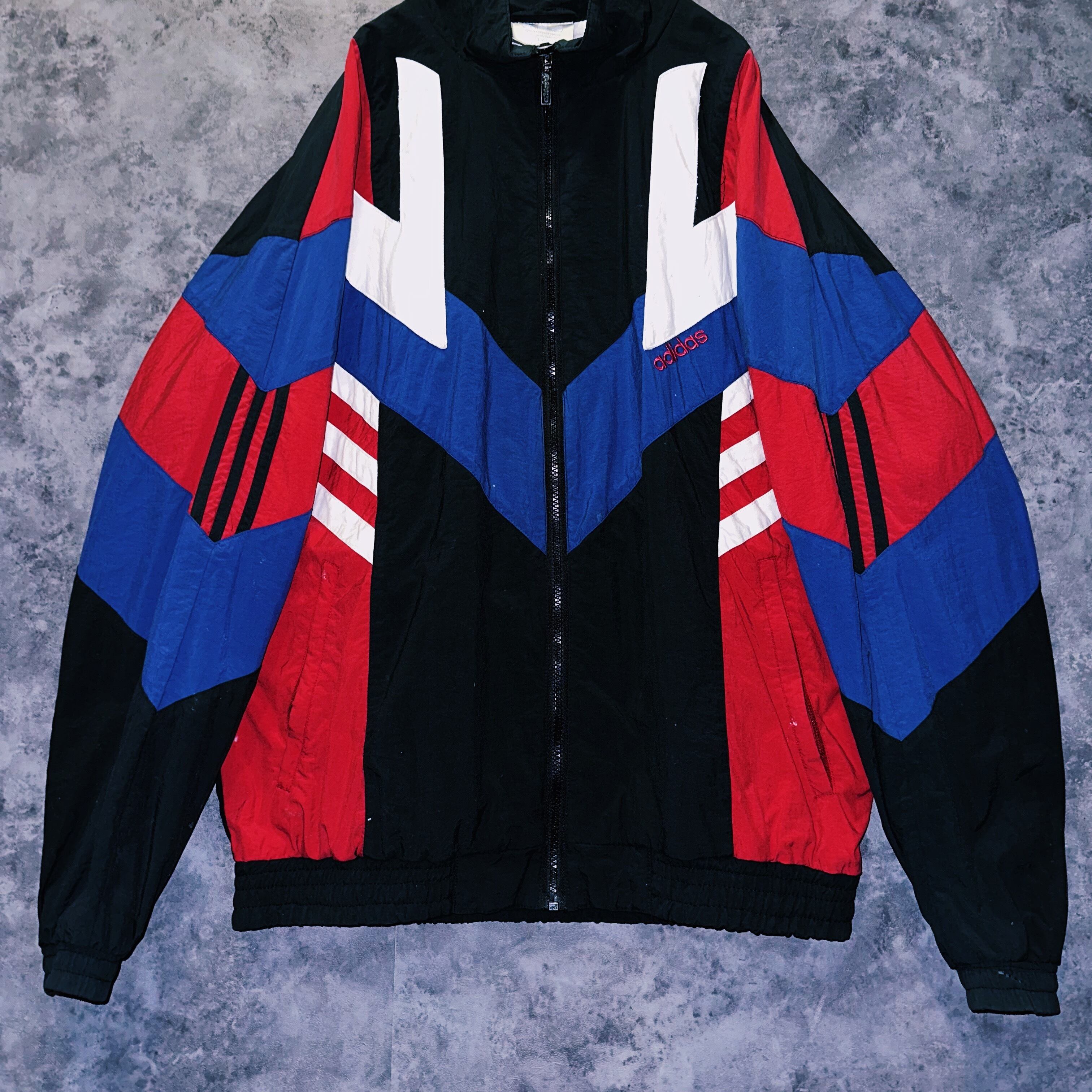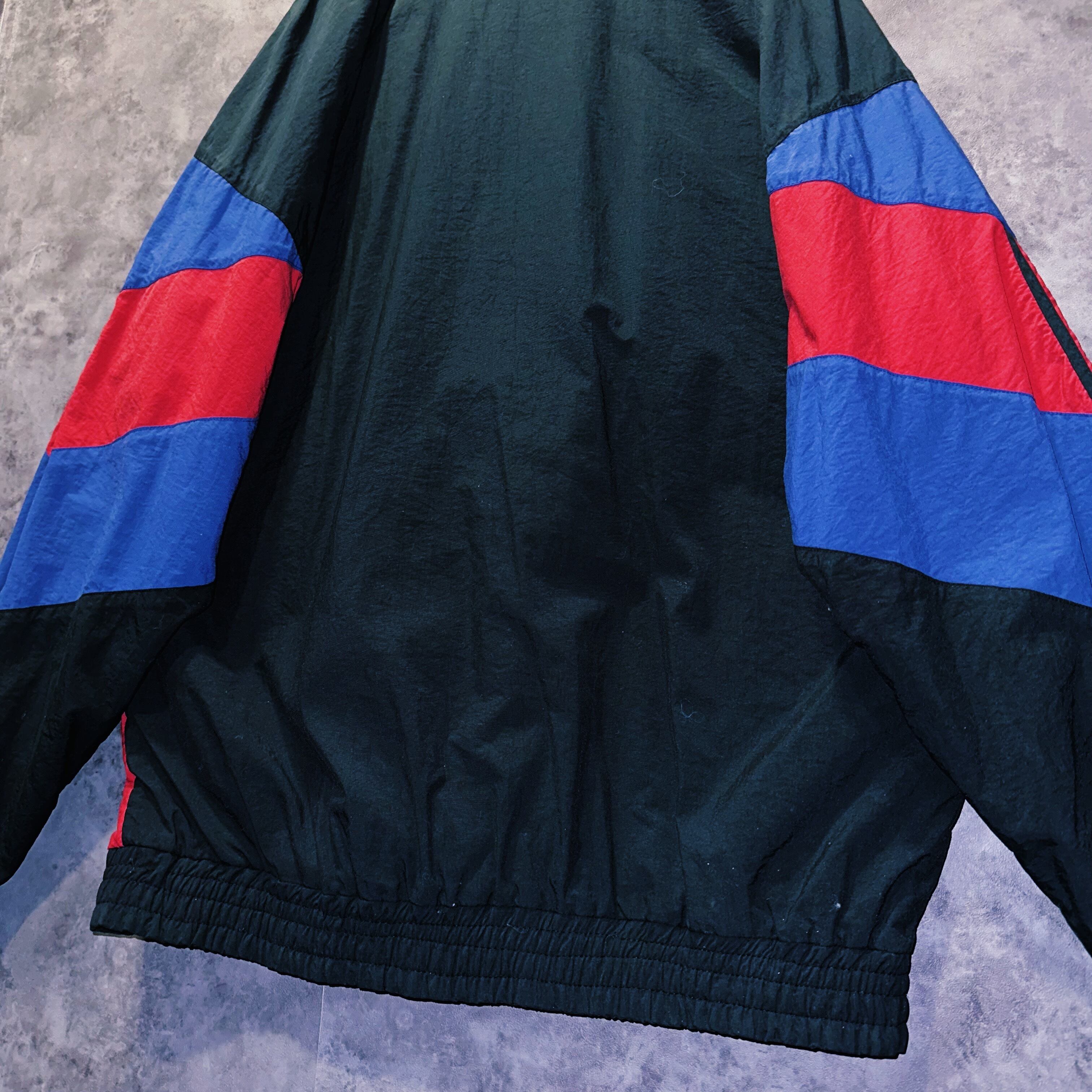 マルチカラーでブラックカラーがベースでレッドとブルーカラースウィッチングが施されている多色なトラックジャケット。