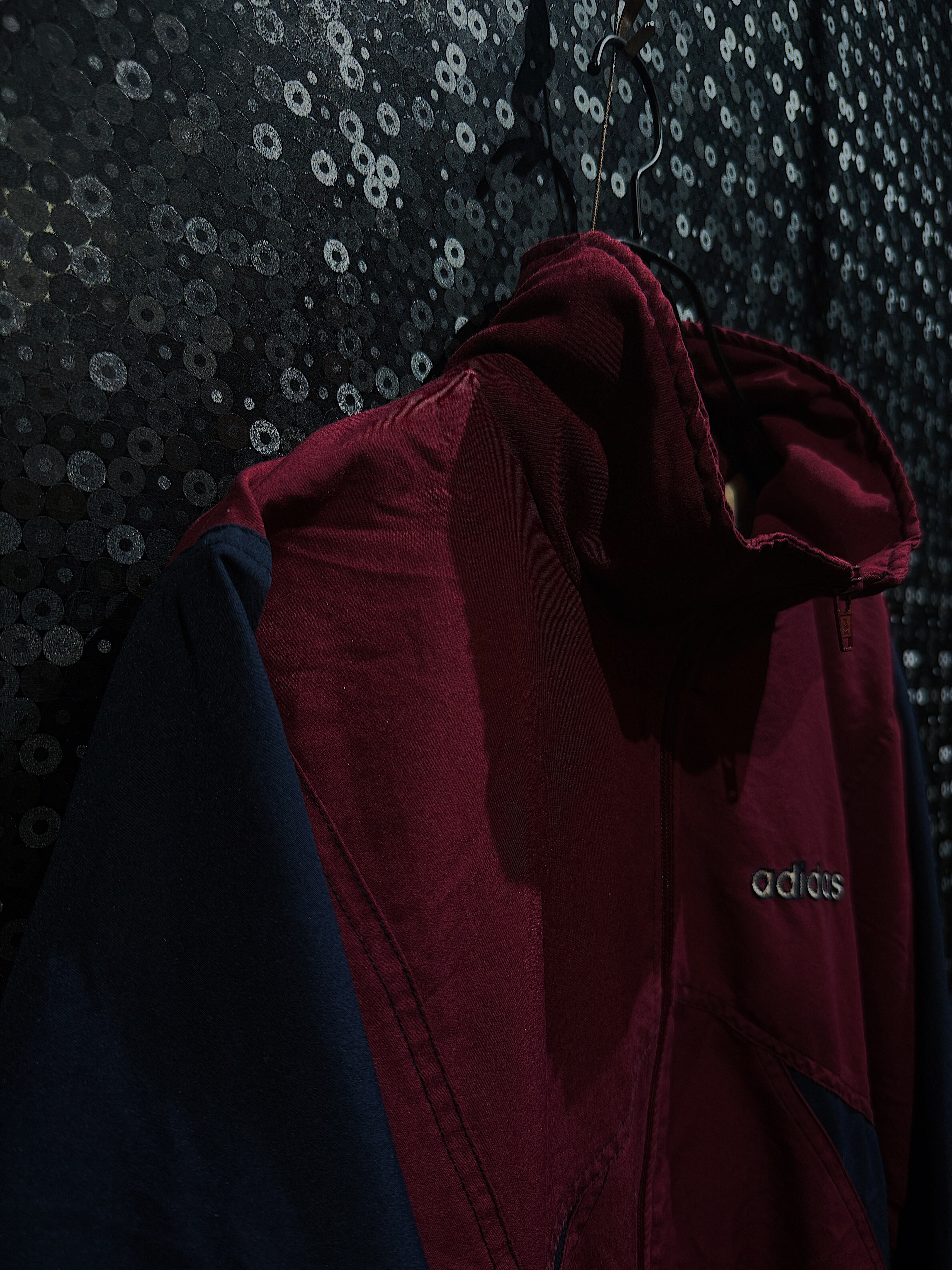 adidasのヴィンテージトラックジャケット。90年代後半から2000年代初頭にかけて製造されたと考えられるアイテムで、レトロな雰囲気漂うバーガンディとネイビーのツートーンカラーが特徴です。