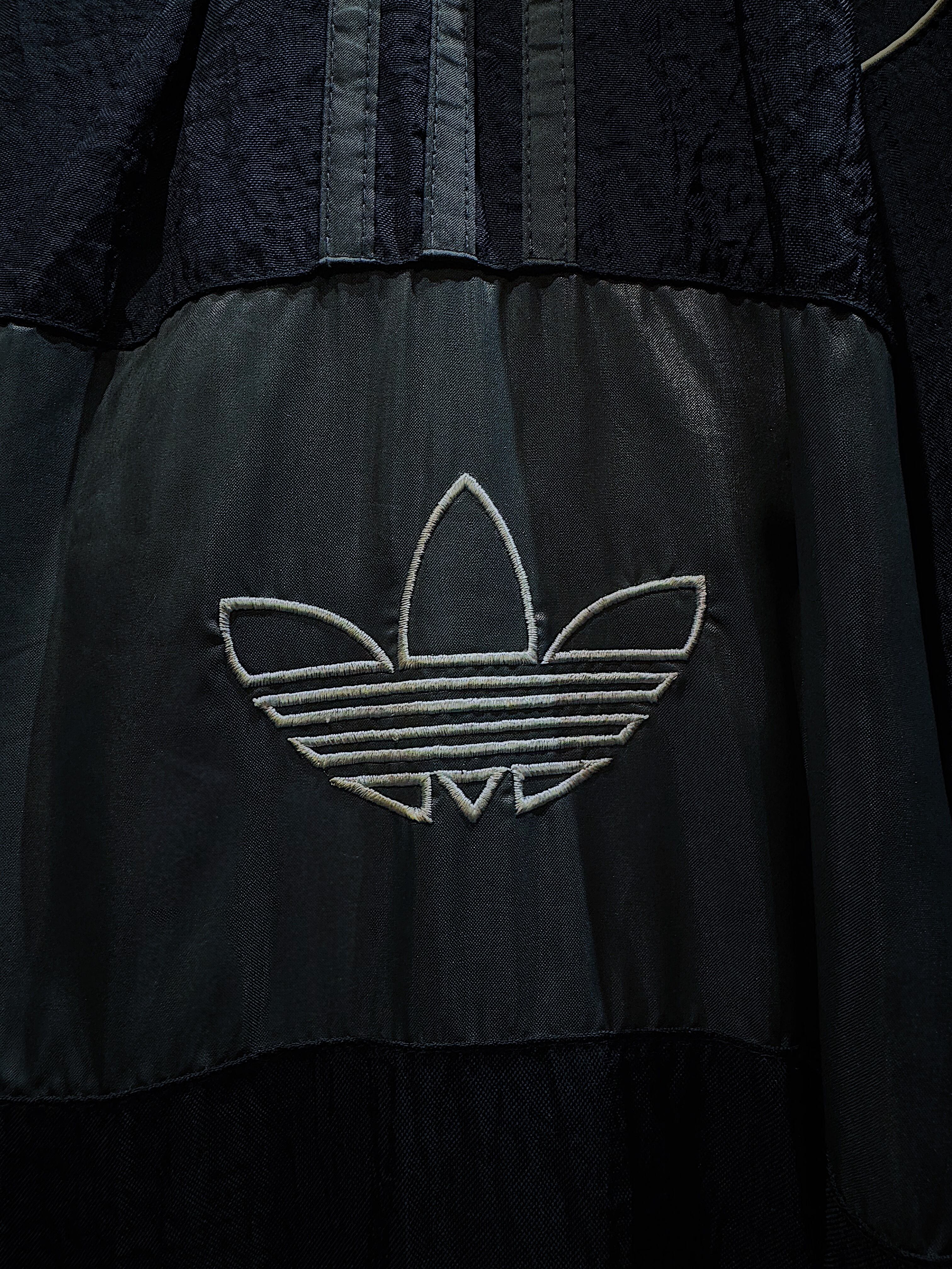 こちらはadidasのヴィンテージフーディジャケット。全体を引き締めるブラックベースに、絶妙なバランスで配置されたホワイトのパイピングとプリントが映える、90年代特有のスポーツミックスデザインです。