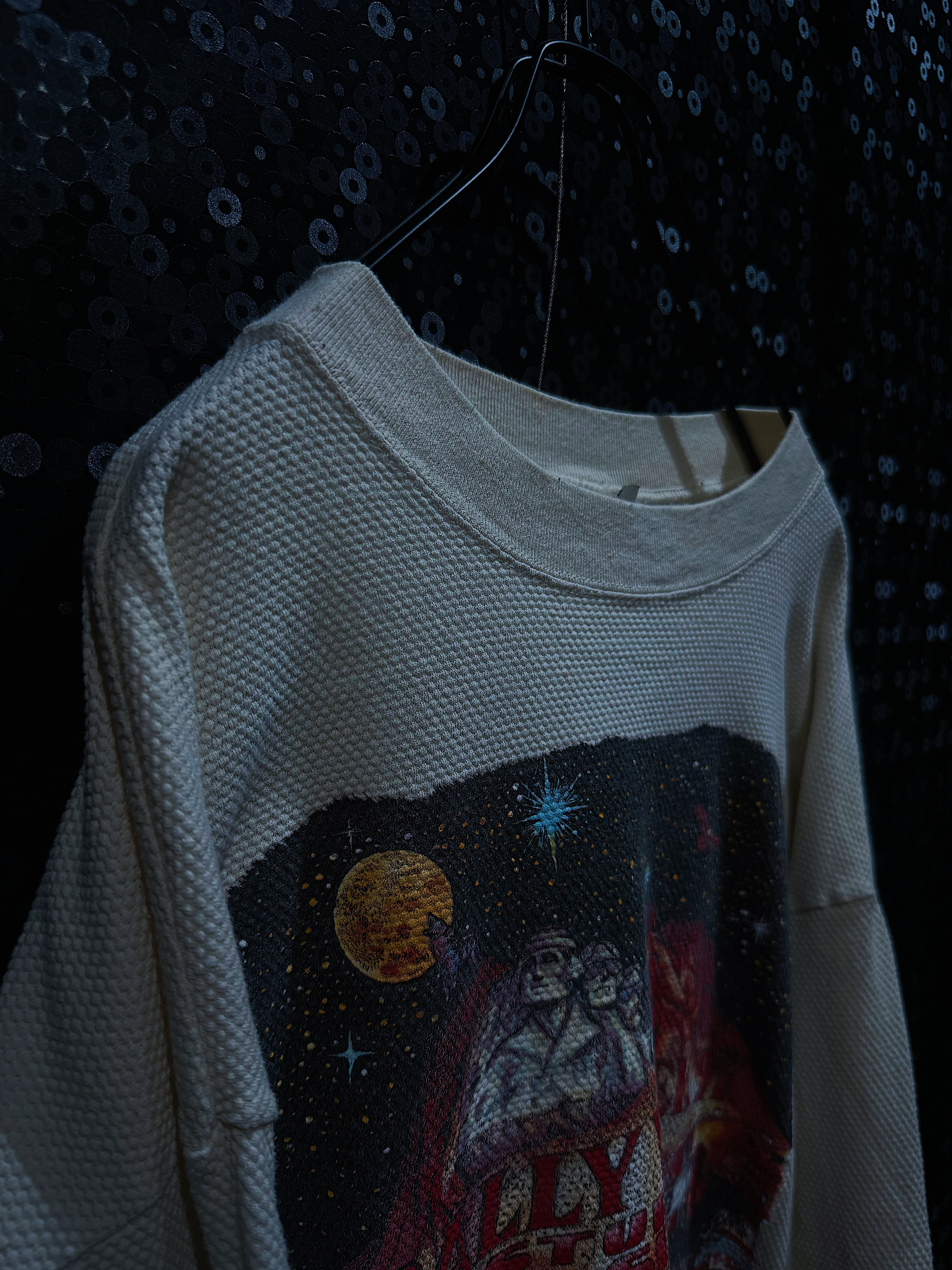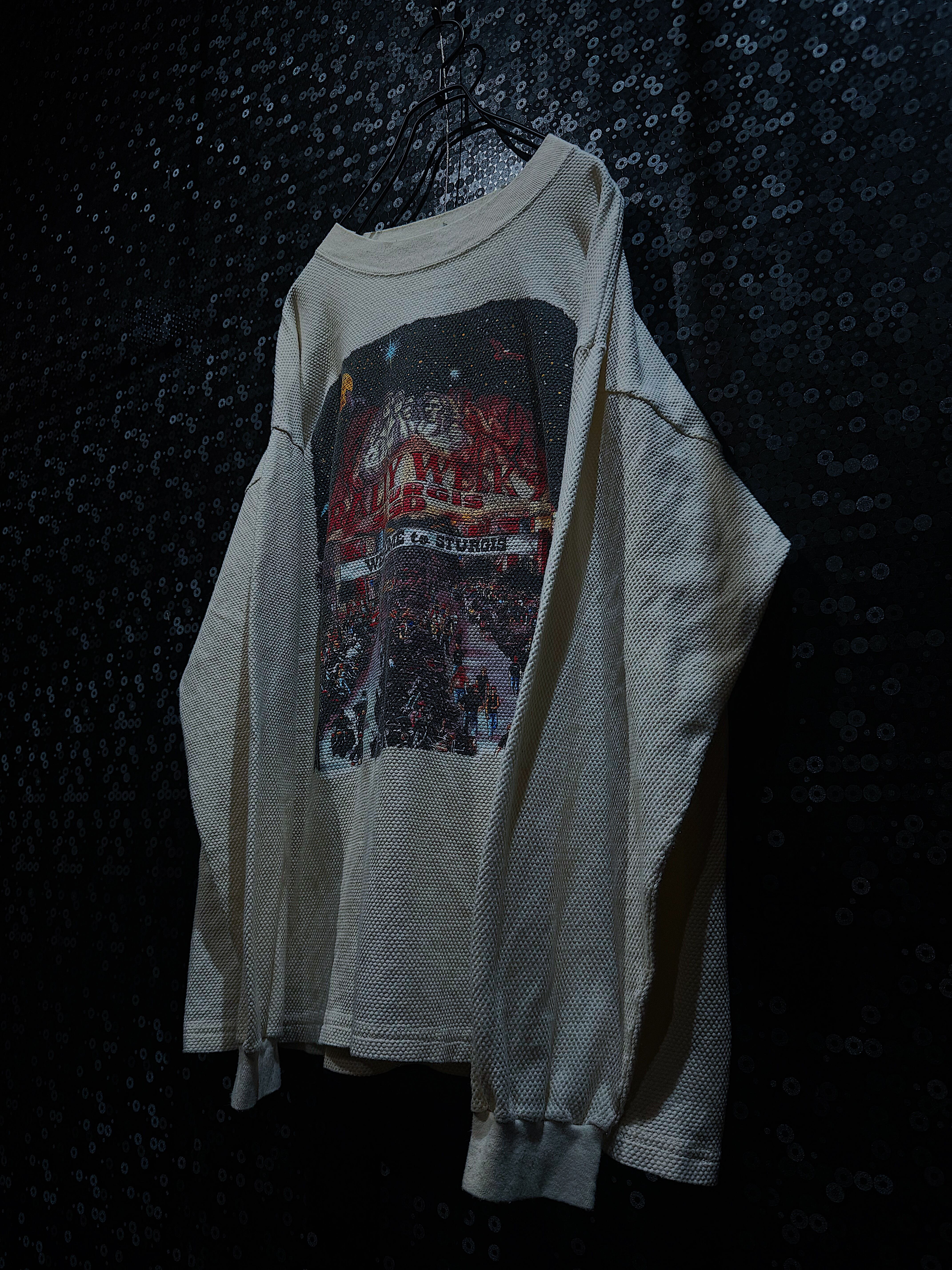 こちらは「Rally Week 1995」のヴィンテージロングスリーブTシャツです。フロントには大迫力のバイカーイベントを描いたグラフィックプリントが施され、バイクカルチャーの熱気とエネルギーが伝わってきます。「WELCOME TO TURGIE」の文字がアクセントとなり、当時の雰囲気を色濃く反映したデザインが魅力です。