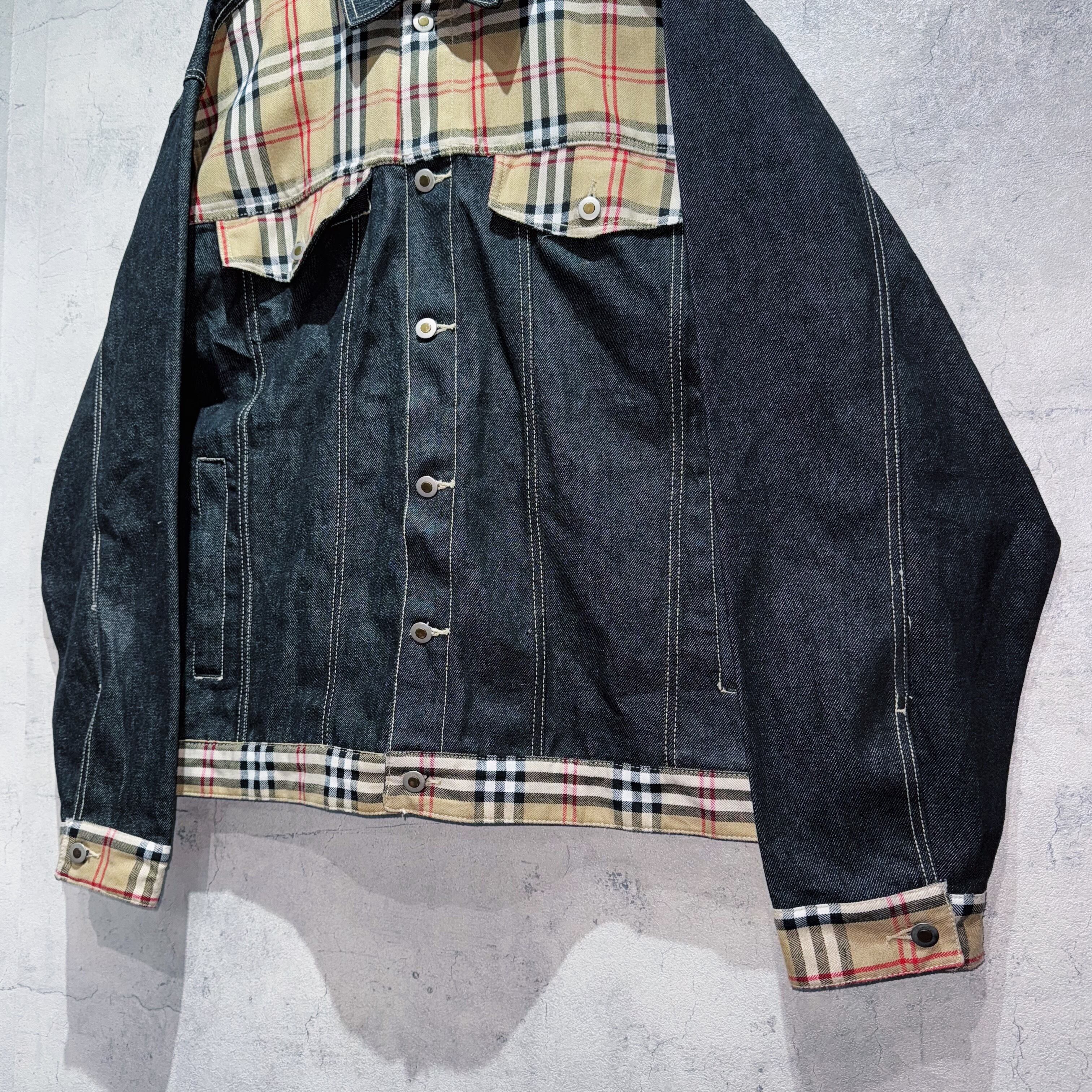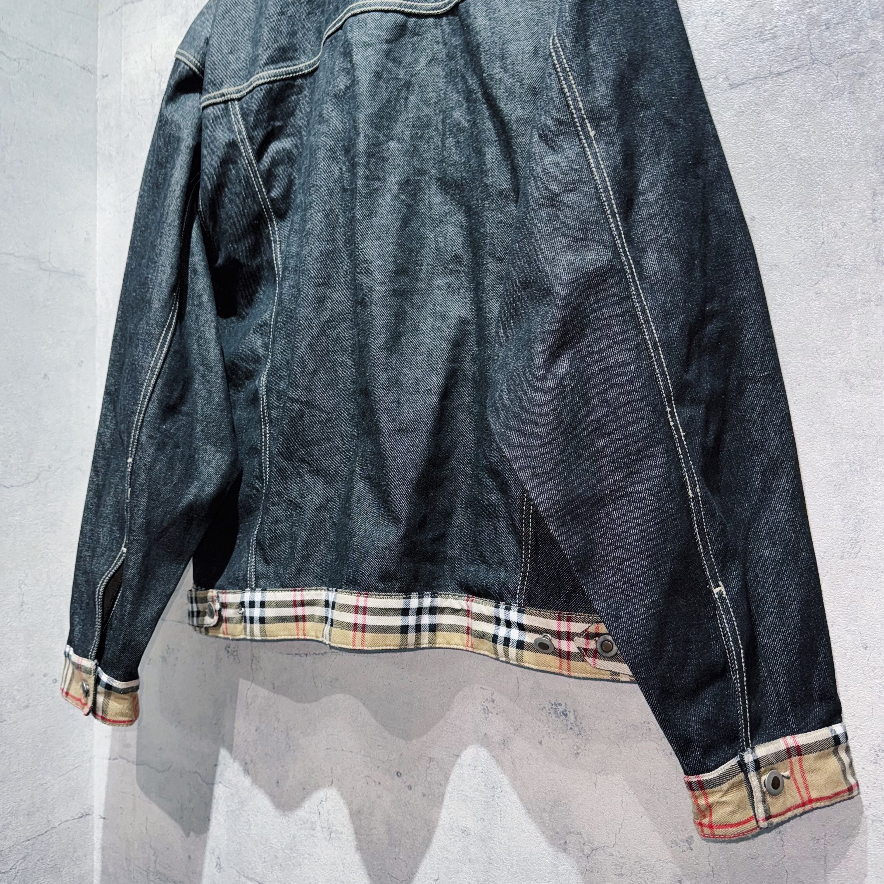 重厚感のあるブラックのデニムにフロントや裾、カフス部がバーバリーの象徴柄としても有名なノバチェックを載せたトラッカージャケット。