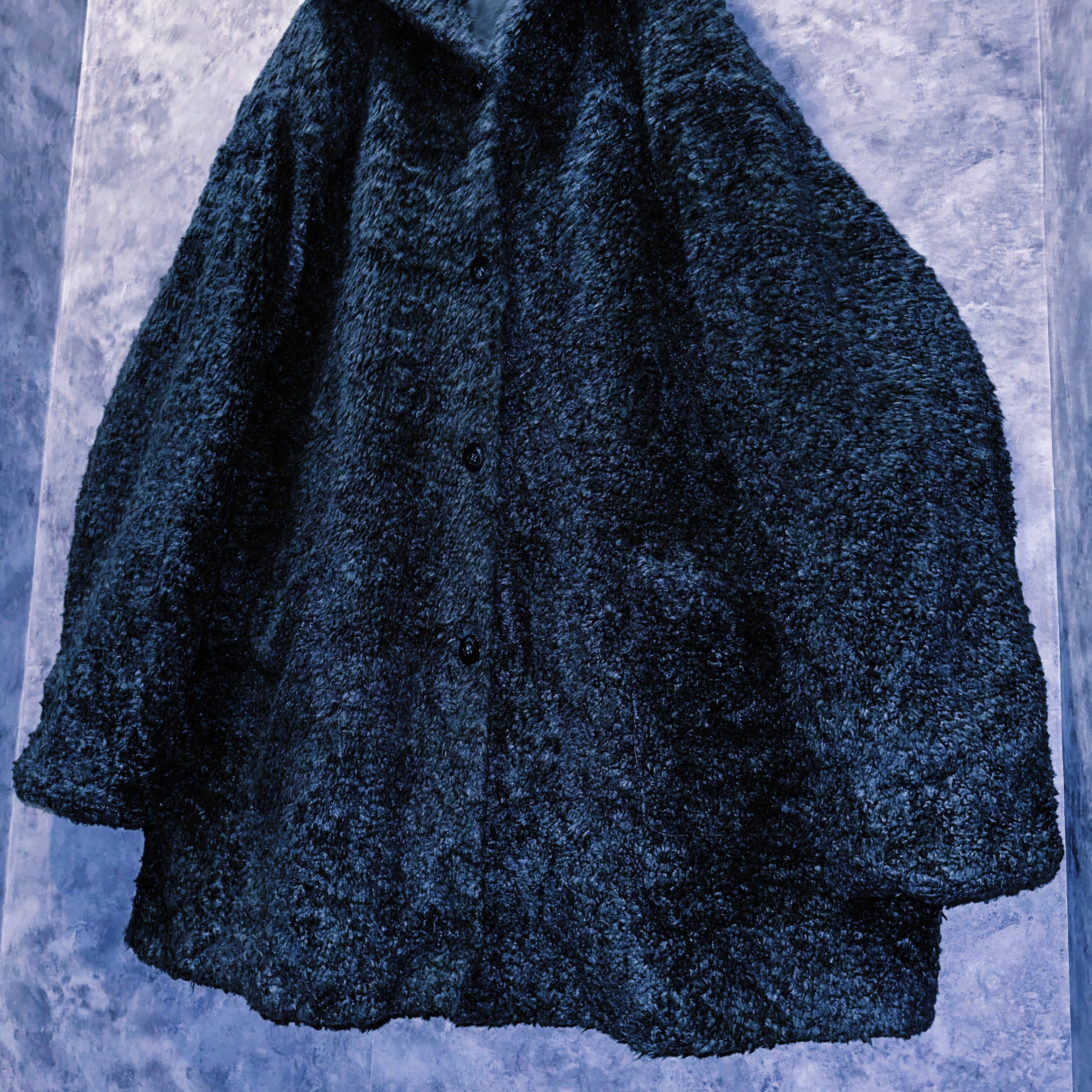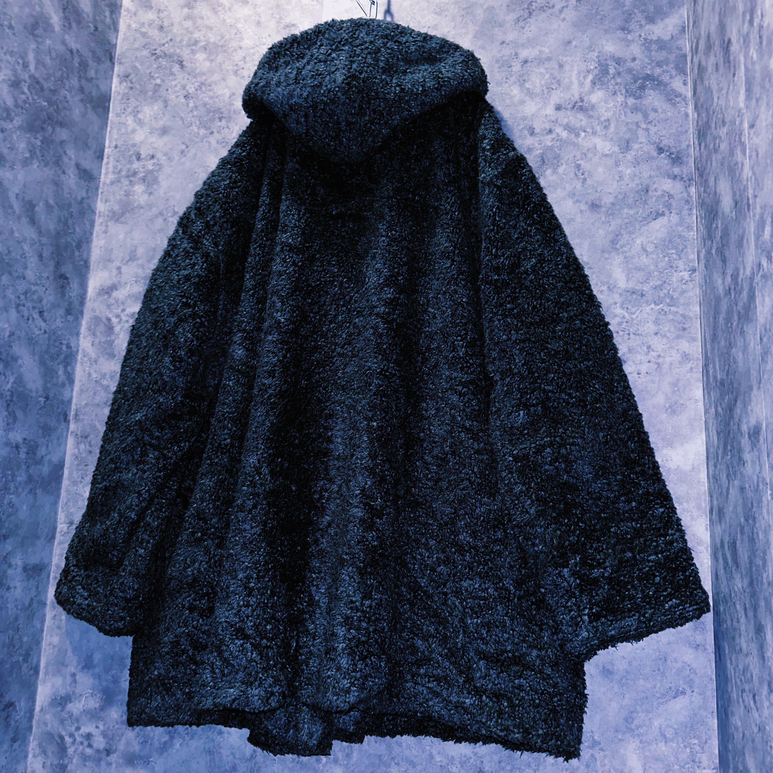 ダークチャコールカラーのボアファーが全体に施されたフーディージャケット。近年価格高騰しているファーのアイテムはフェイク素材でもかなり著しいです。その中でも柔らかいボアデザインの効いたフーディージャケットが新入荷。