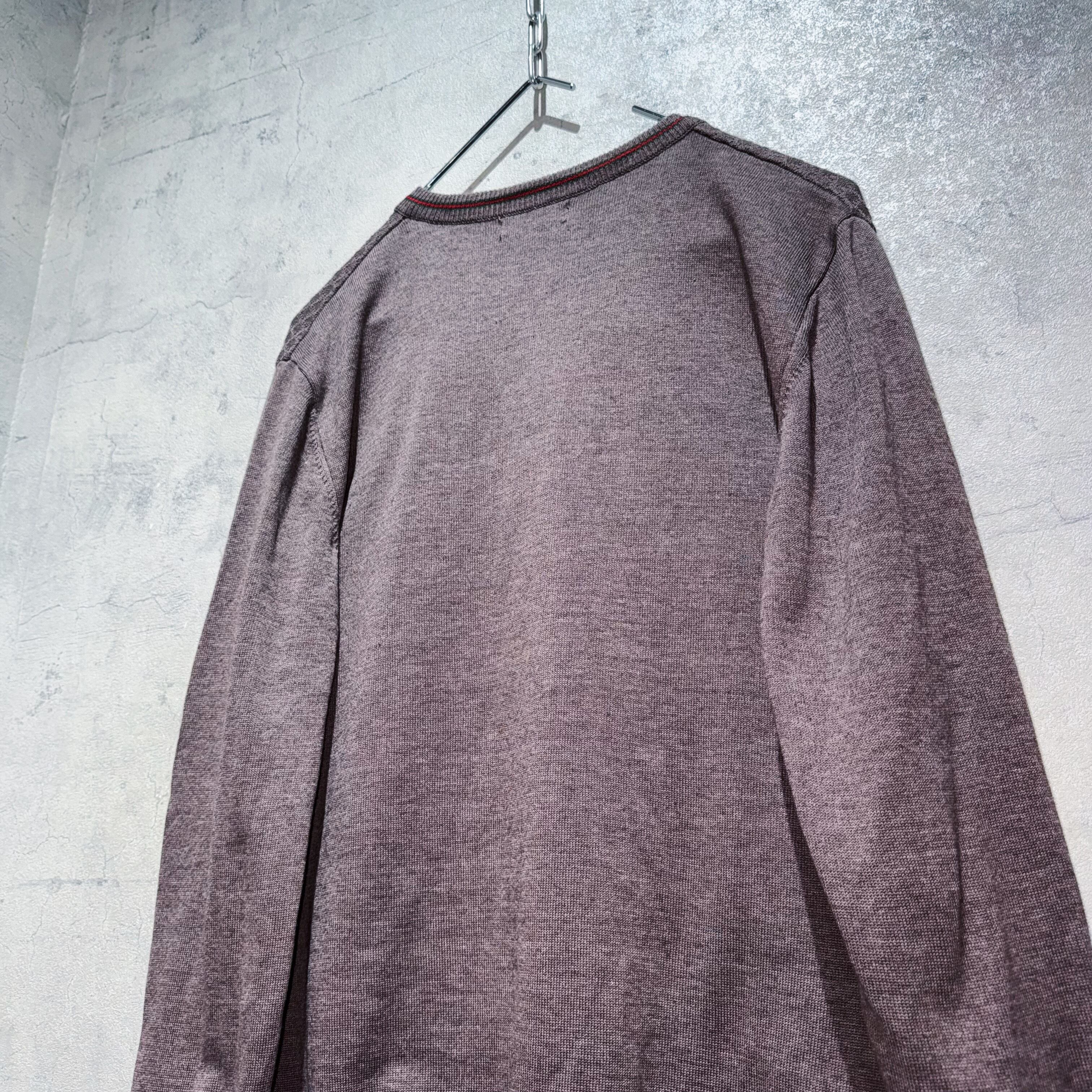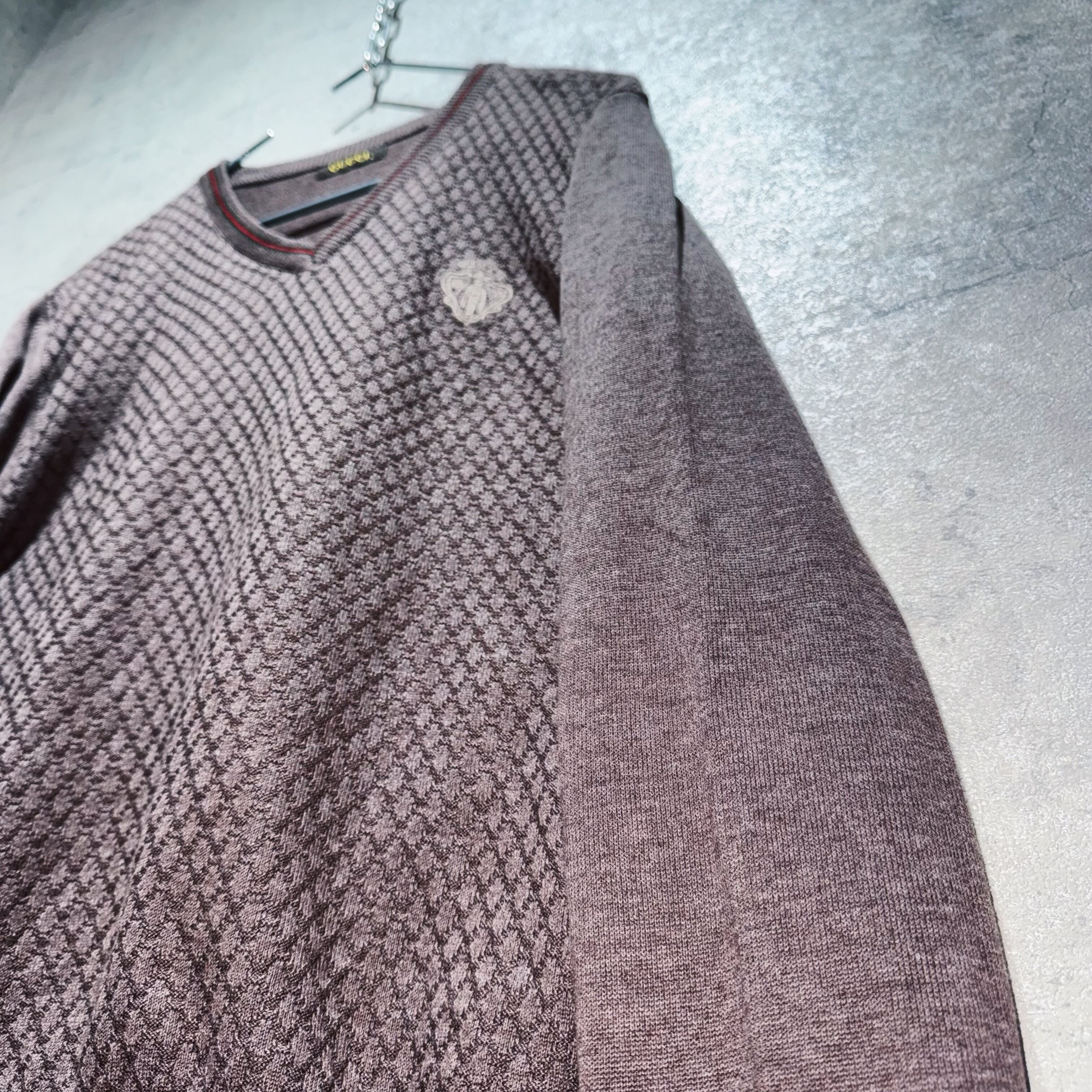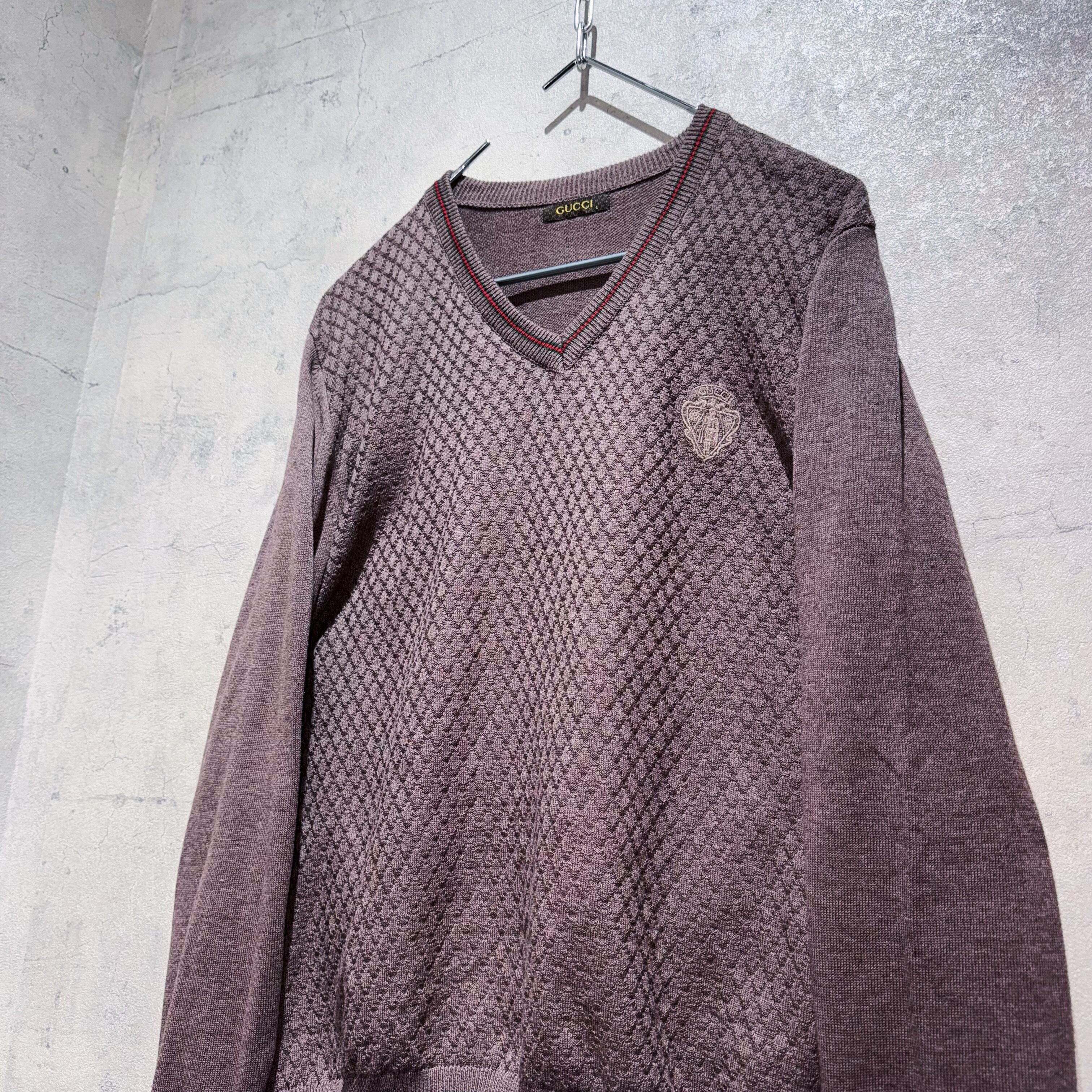 パープル系のボディにキルティング柄をあしらい、胸元にはグッチといえばエンブレムデザインの刺繍を刻んだVネックニット。