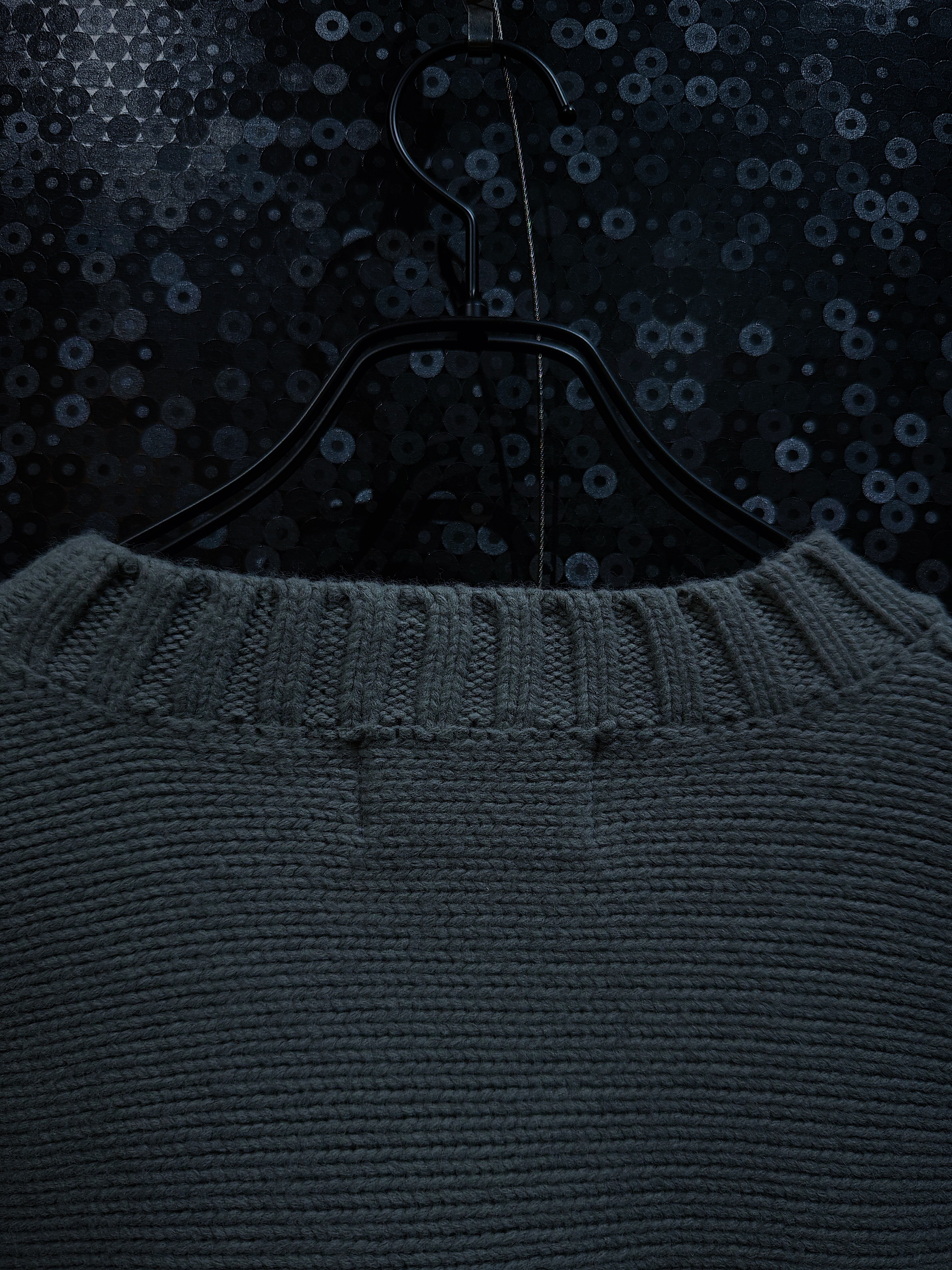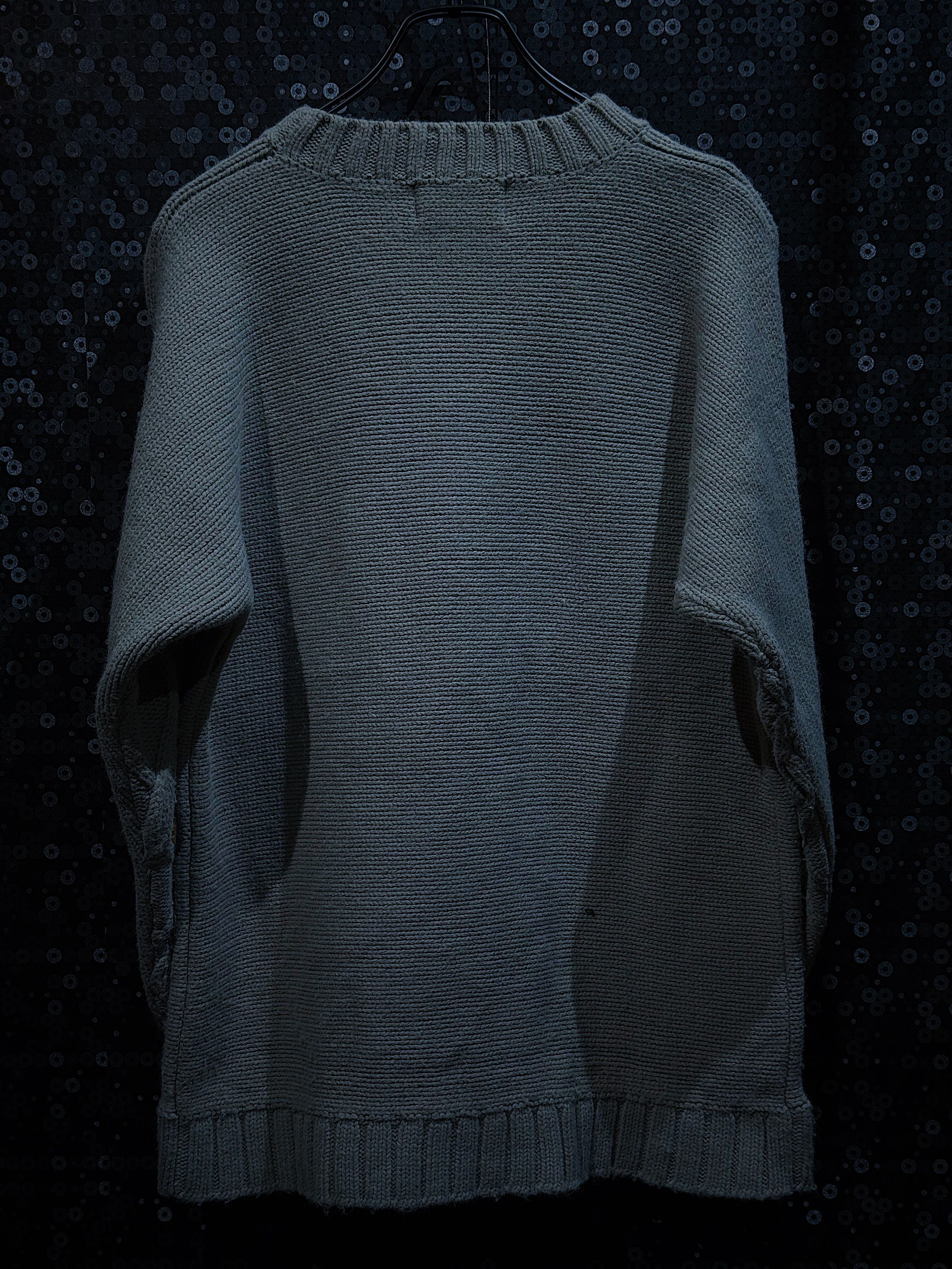 ニット特有の立体的な織りが施され、デザインの躍動感をより一層引き立てています。ボディはしっかりとした厚みがあり、ウールまたはアクリルの混紡素材が使用されていると考えられます。