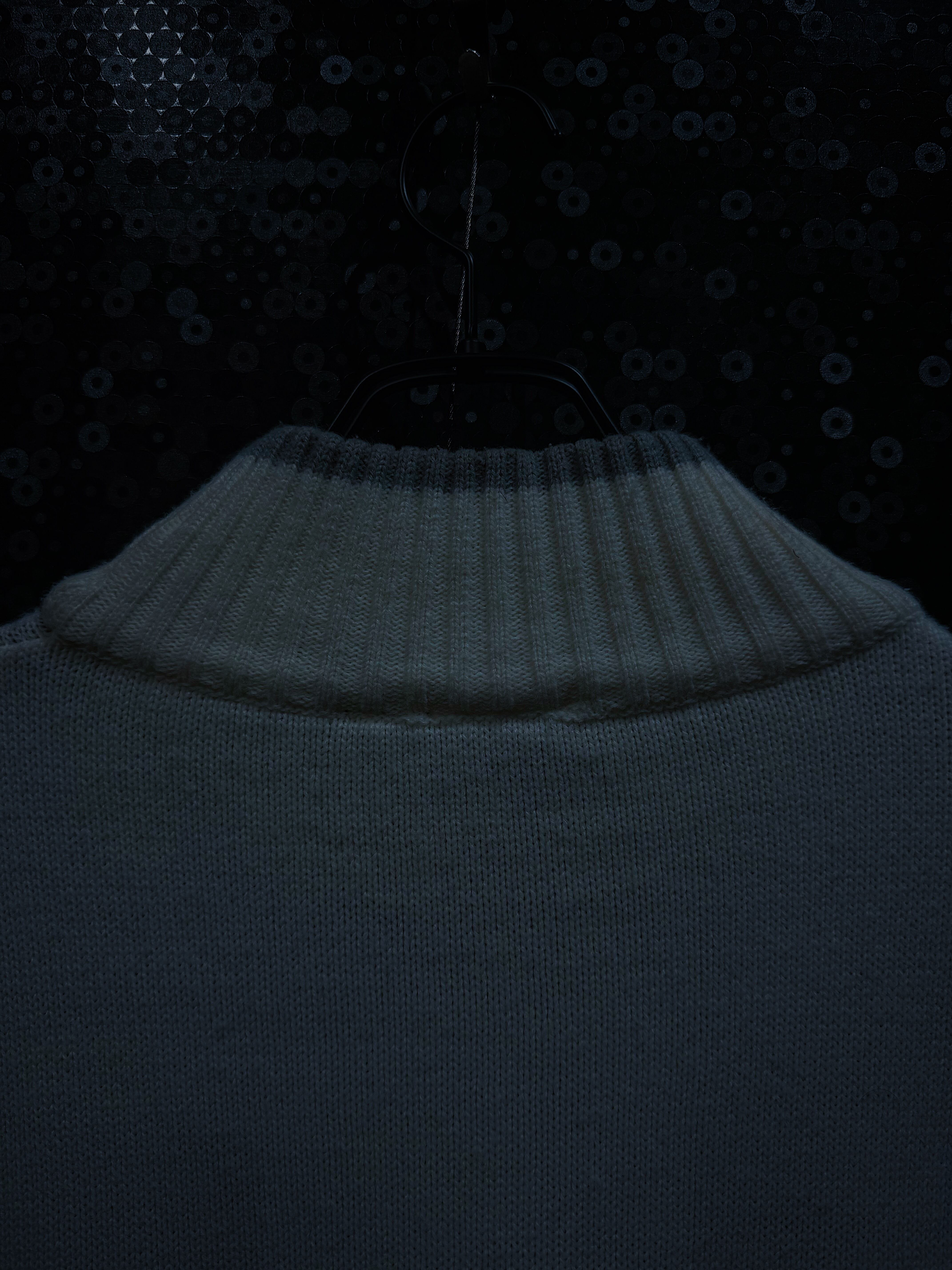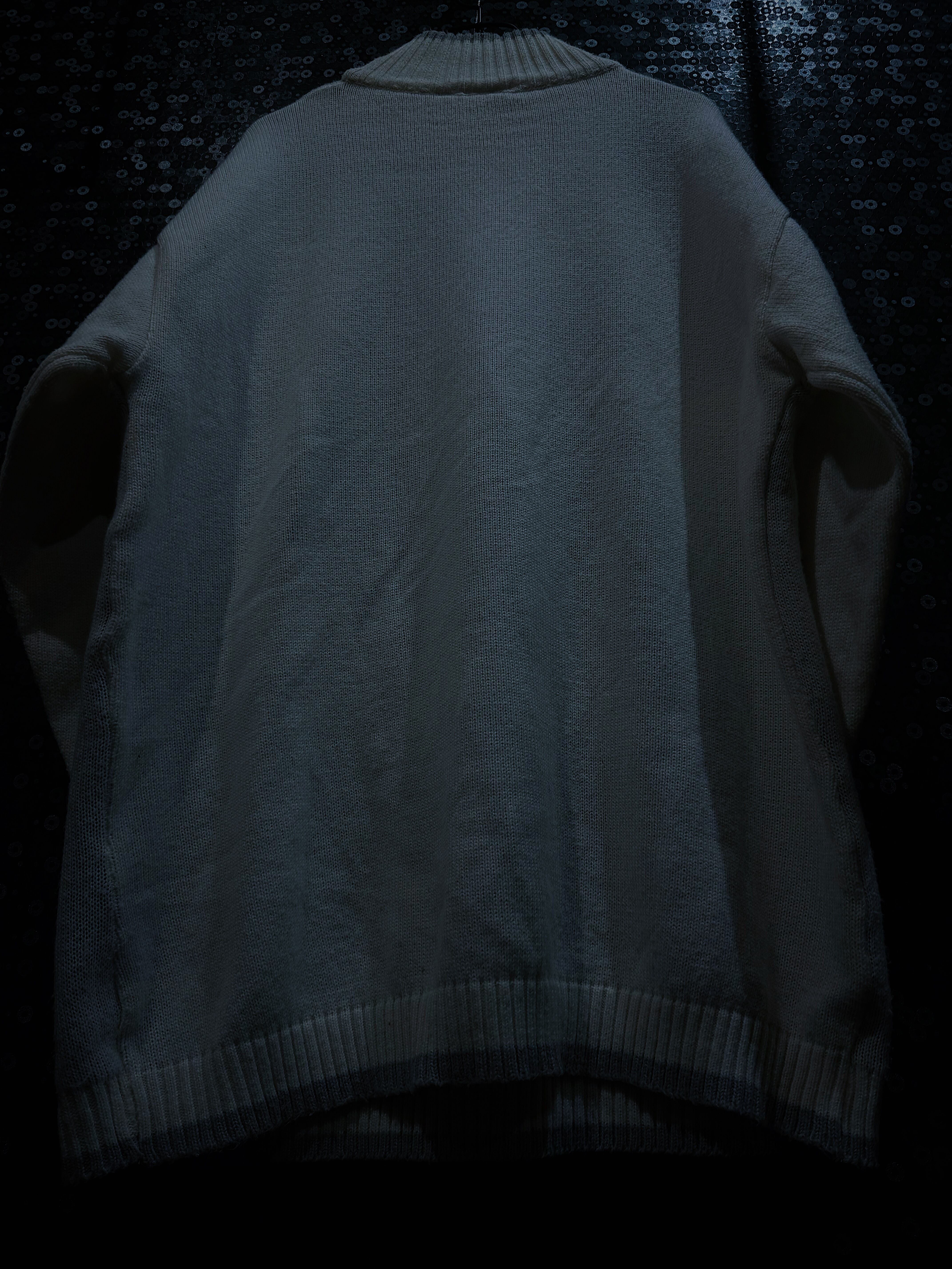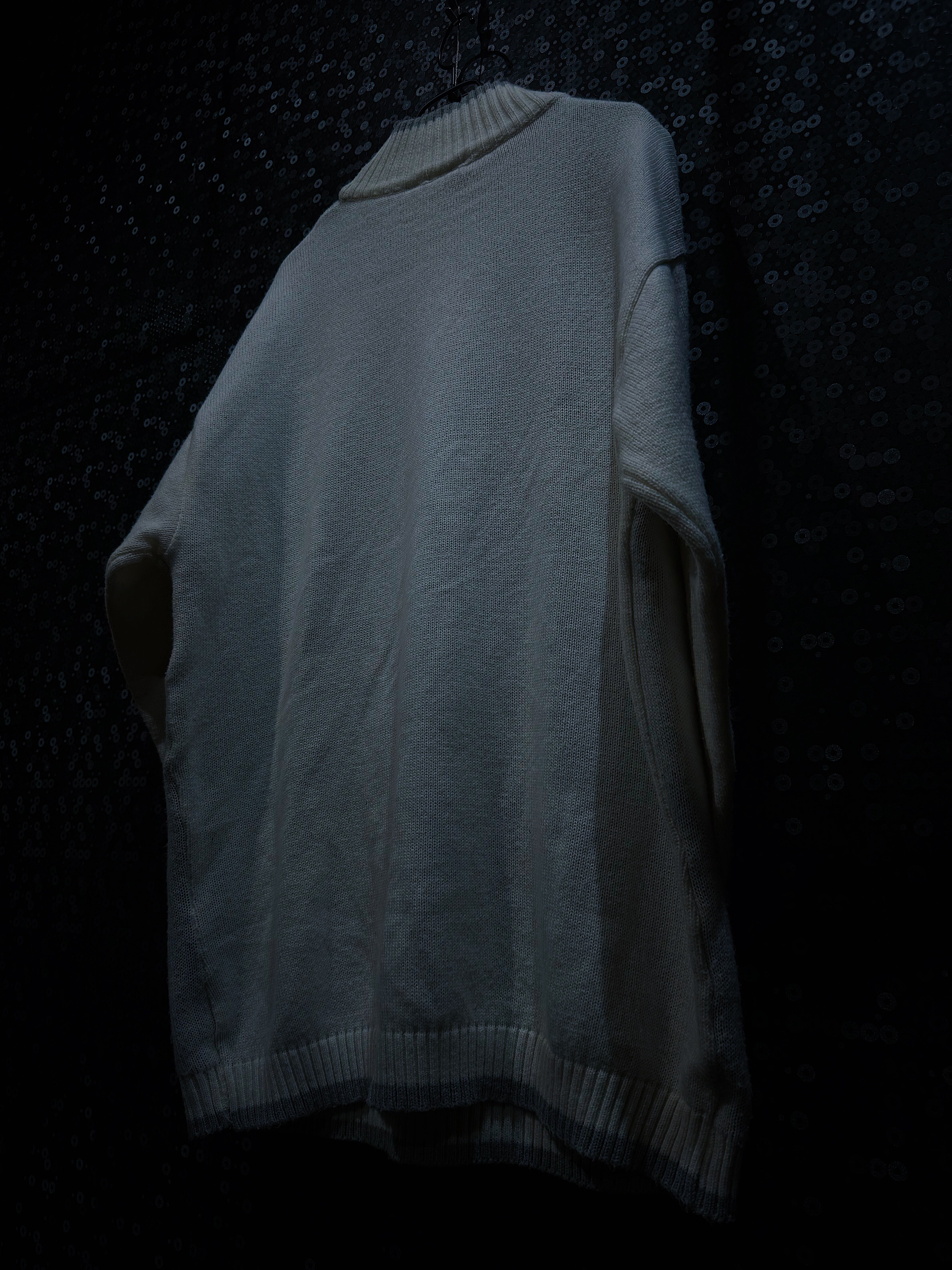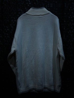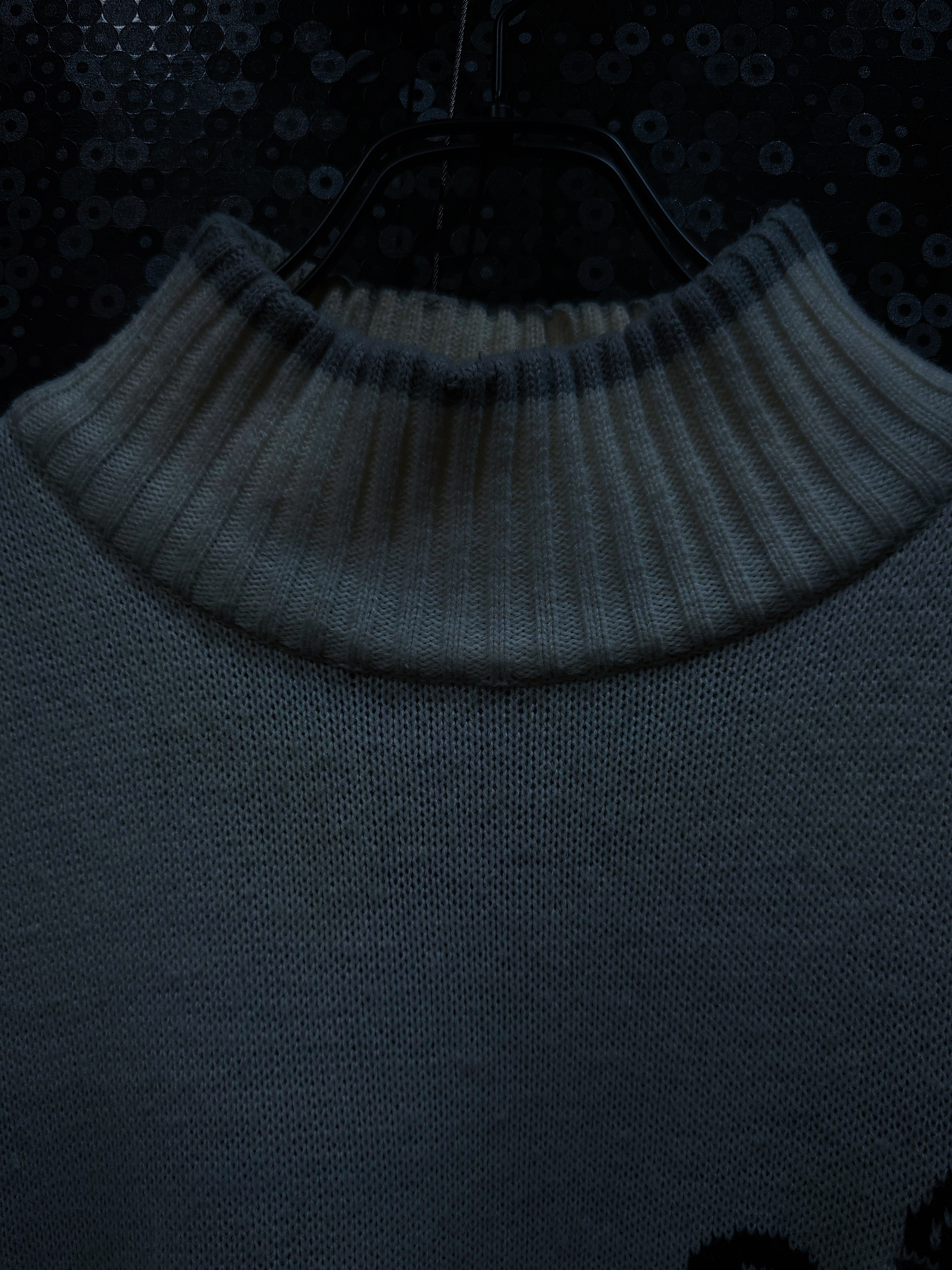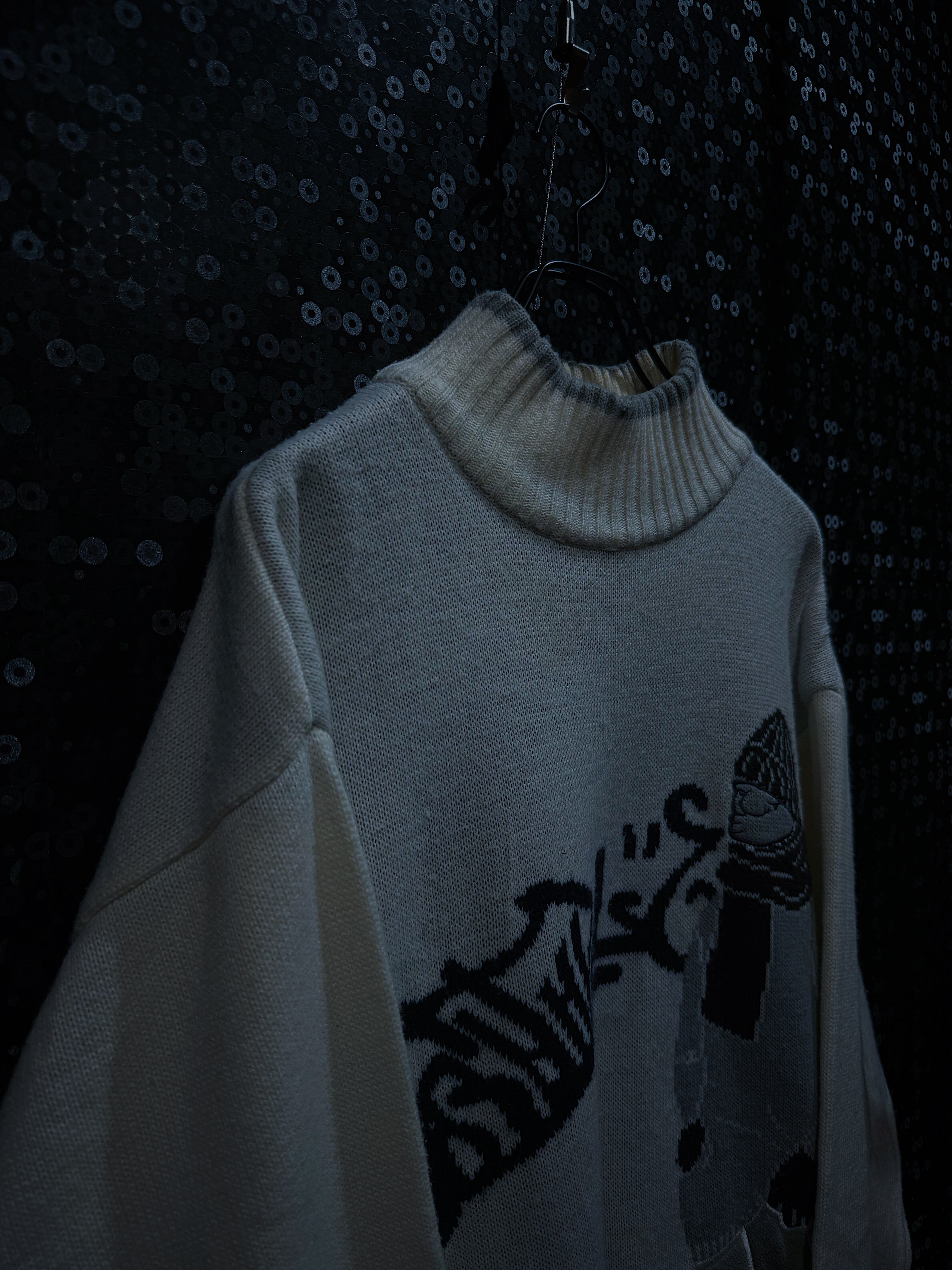 このニットは、ストリートカルチャーを感じさせるグラフィックが特徴的なハイネックのセーターです。