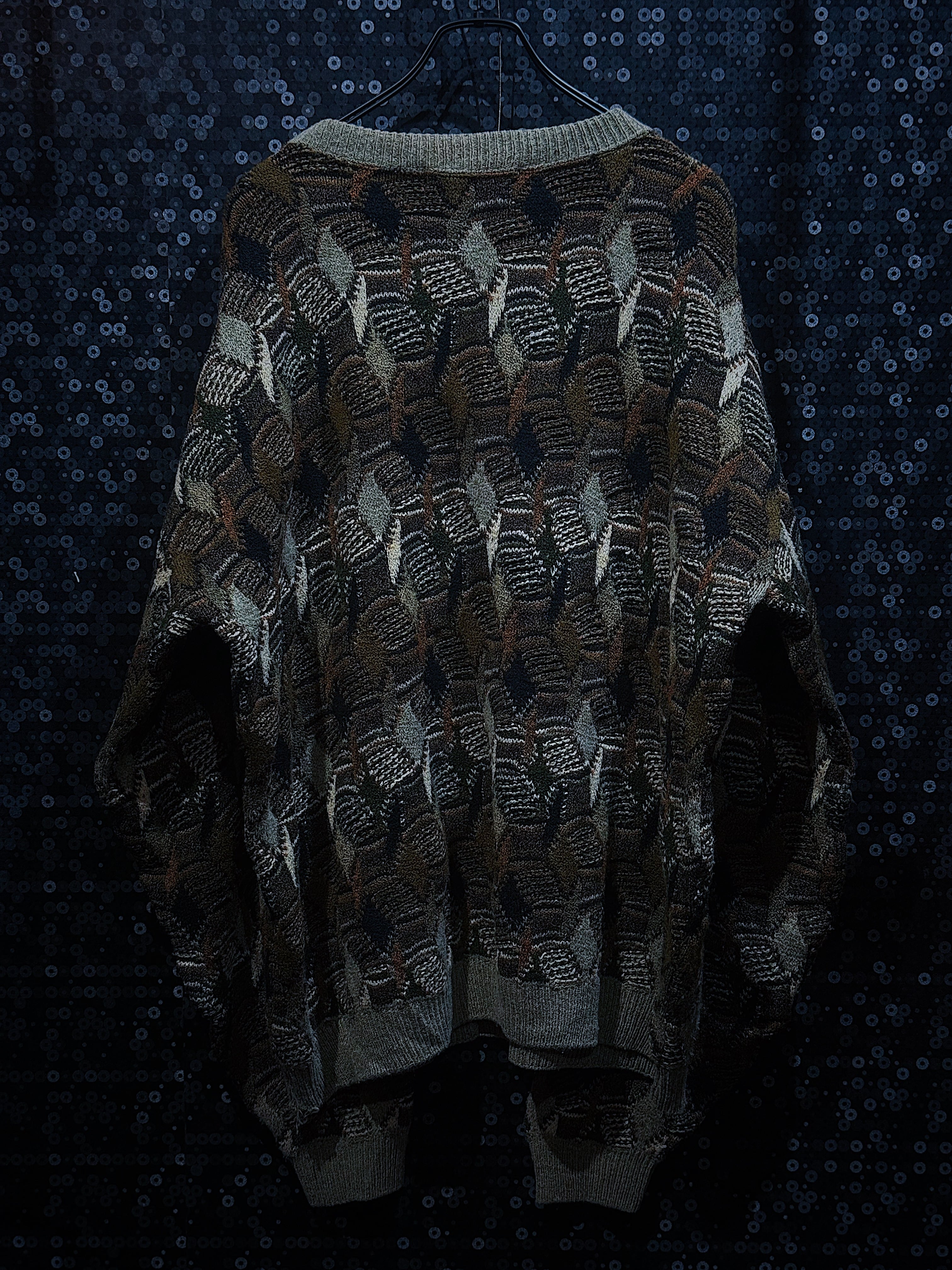 このニットは、Protege Collectionのヴィンテージアイテムで、特徴的な幾何学模様のデザインが施されています。柄の名称としては、**「ジオメトリックパターン(Geometric Pattern)」**に分類され、六角形や菱形が織り込まれたデザインが特徴です。こうしたパターンは90年代のアメリカンニットによく見られ、立体感のある編み込みが魅力的です。