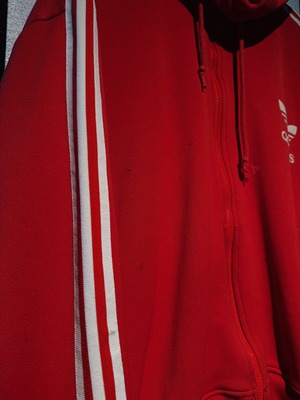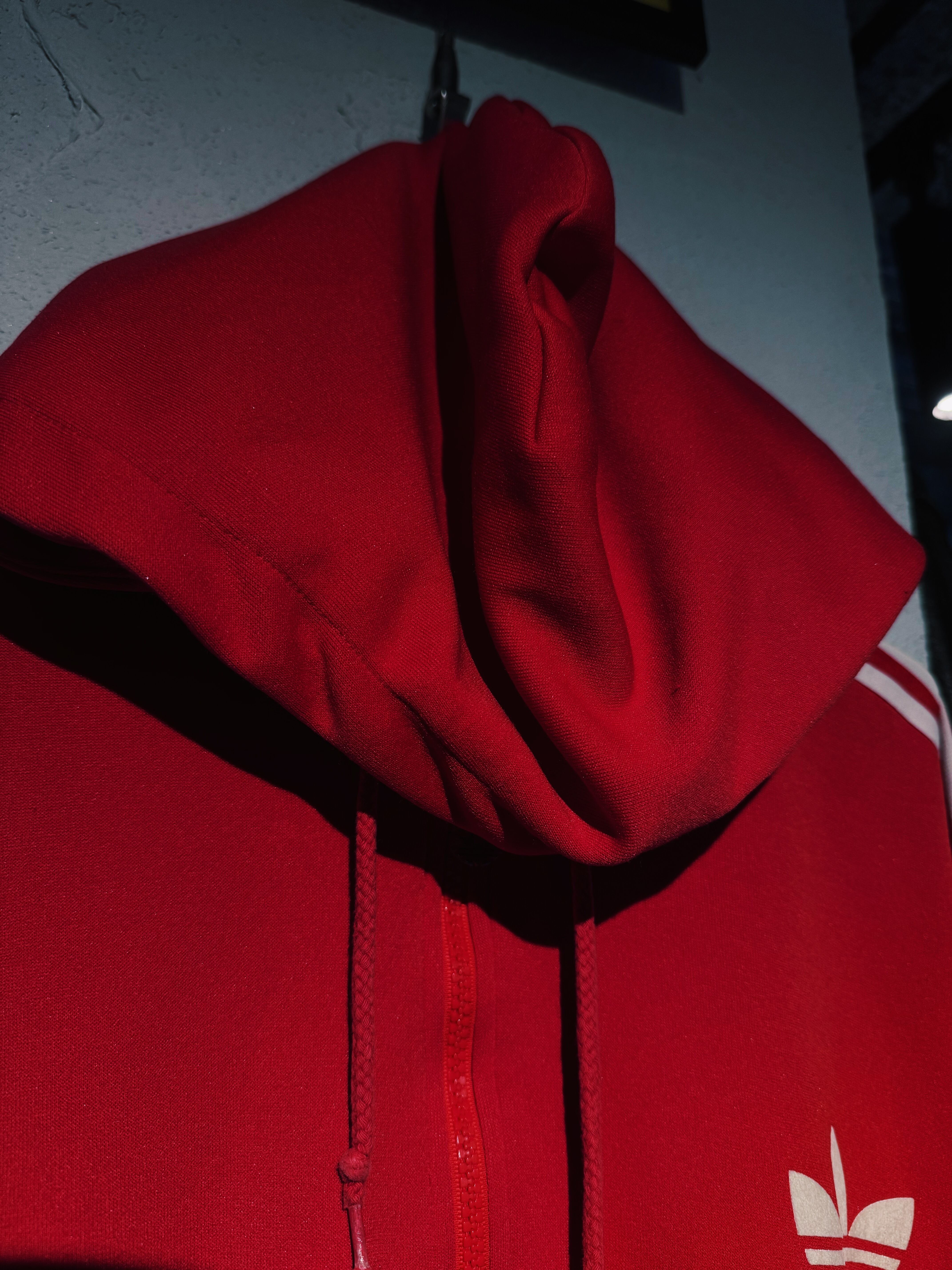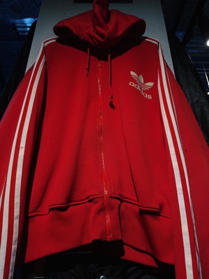 クラシック且つ写真からでも伝わってくる高級感がムンムンのレッドをボディにフーディーを搭載したトラックジャケット。