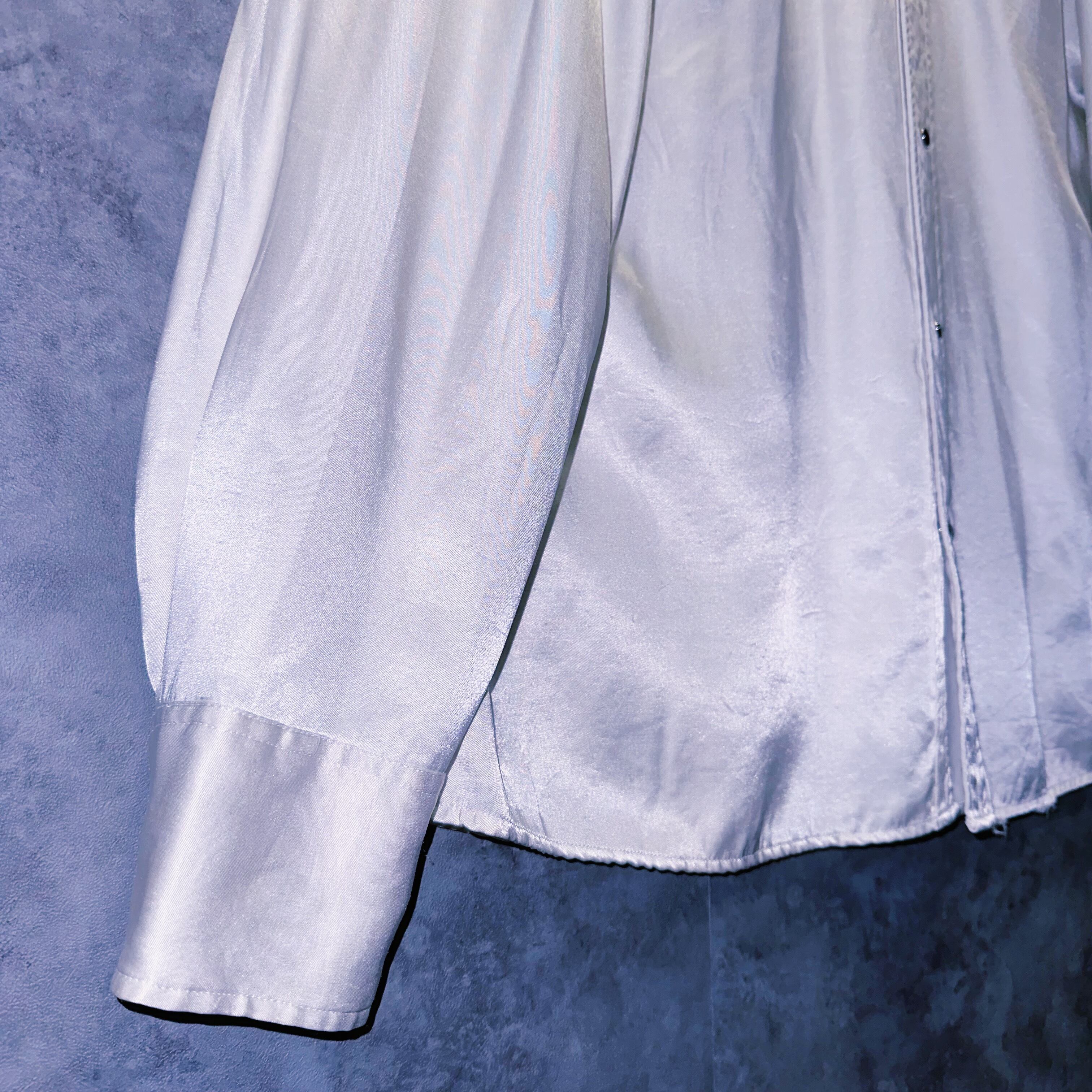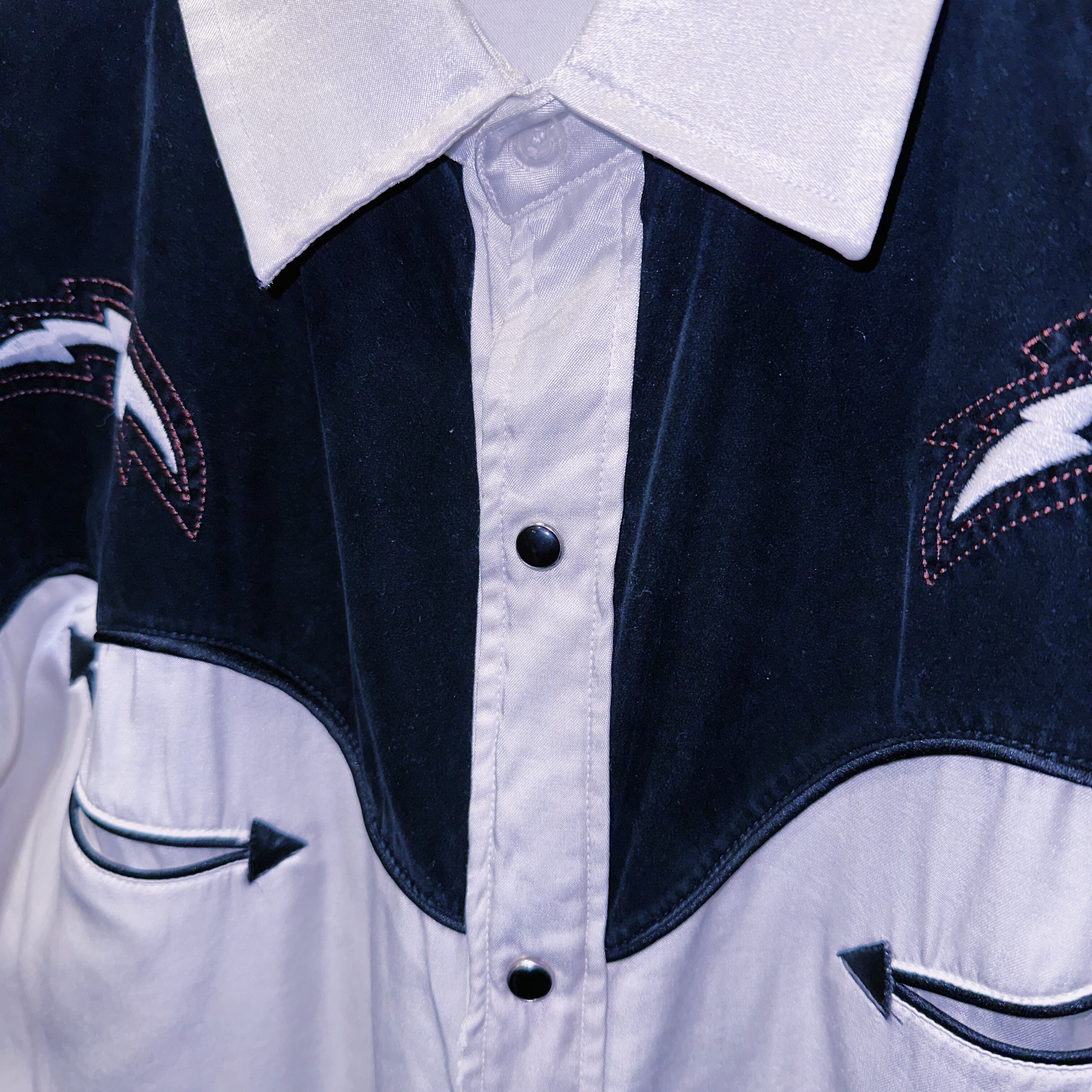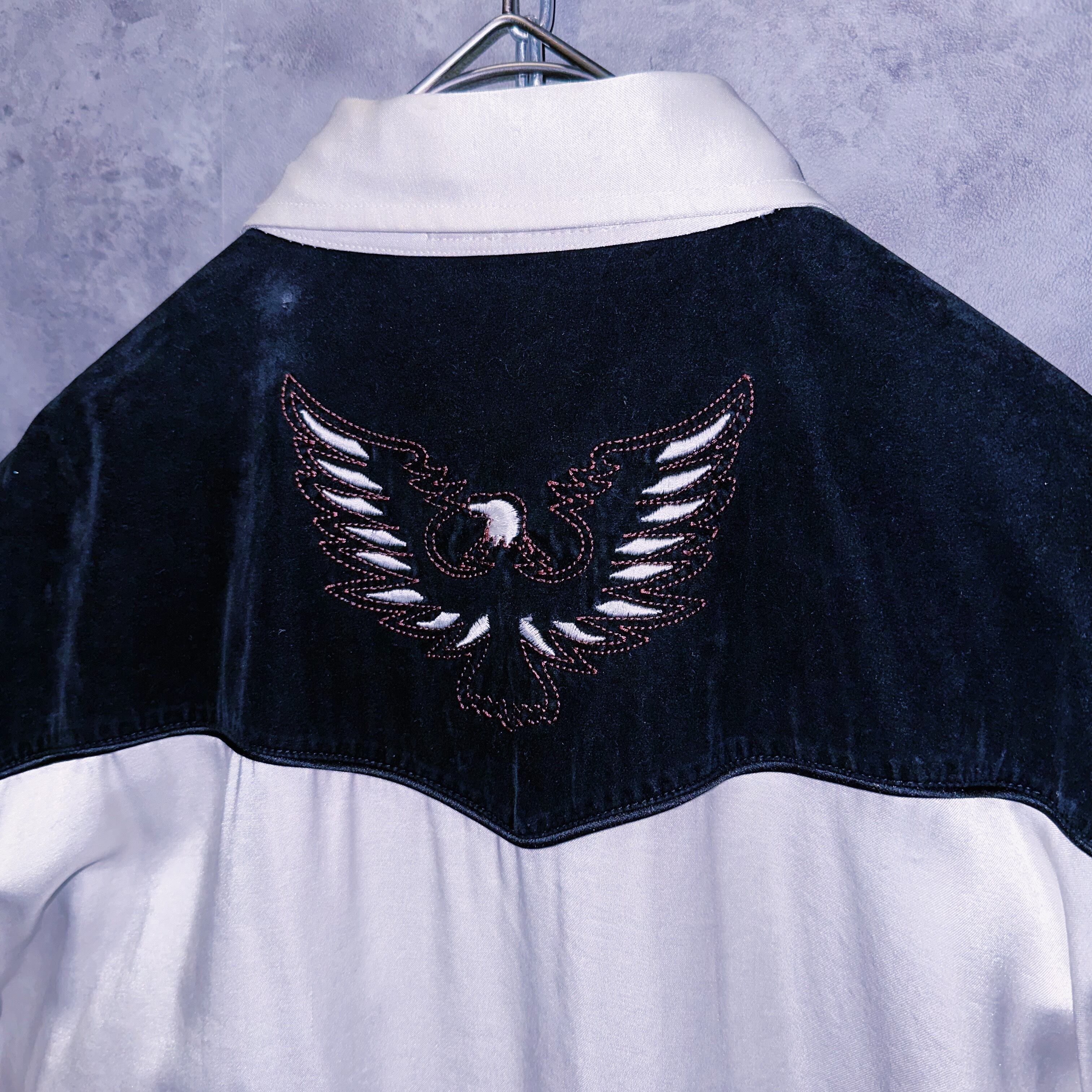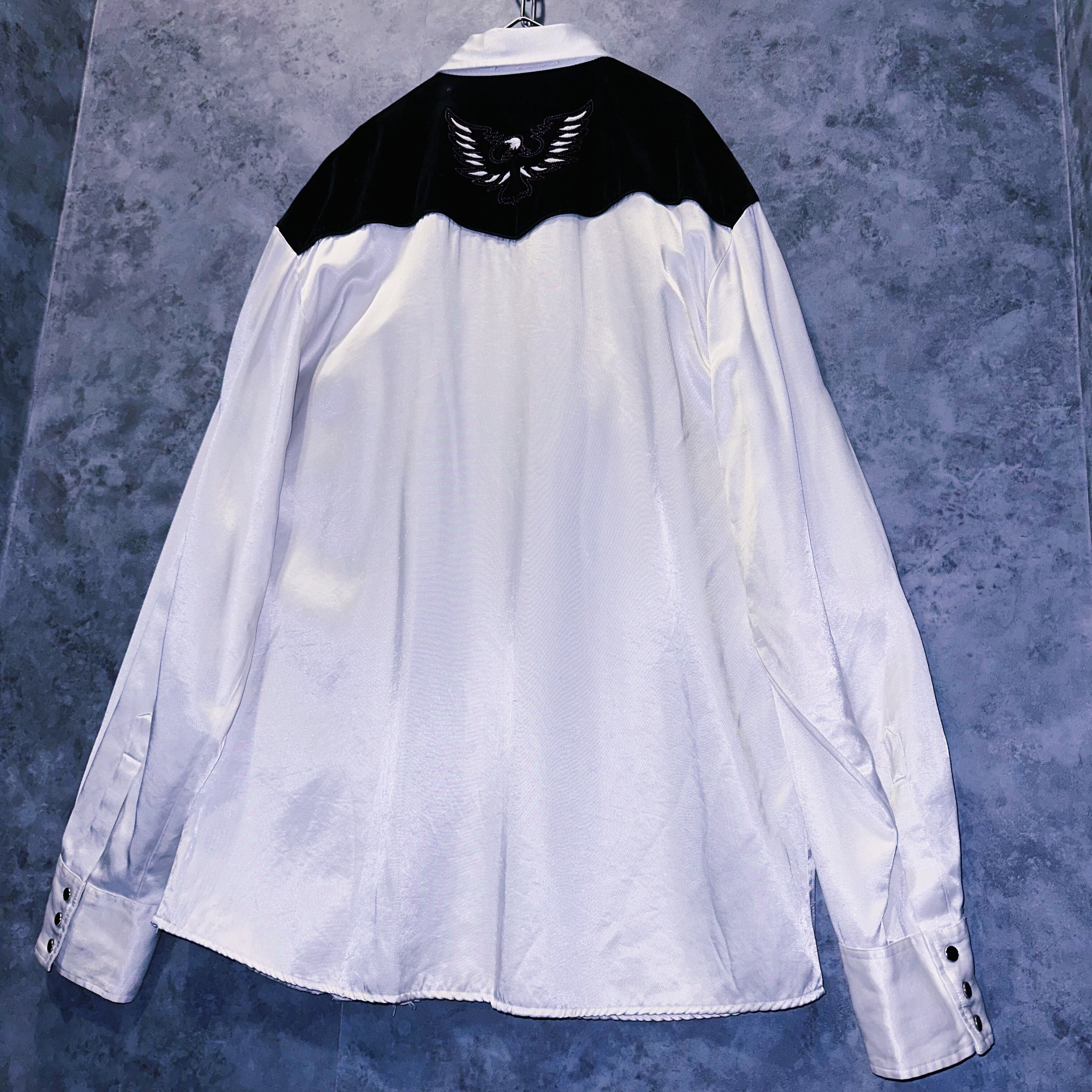 圧倒的な光沢のホワイトボディにフロント、バック部分にはオレンジ色が輝く羽根とイーグルの刺繍を刻んだラグジュアリー感溢れるウエスタンシャツ。
