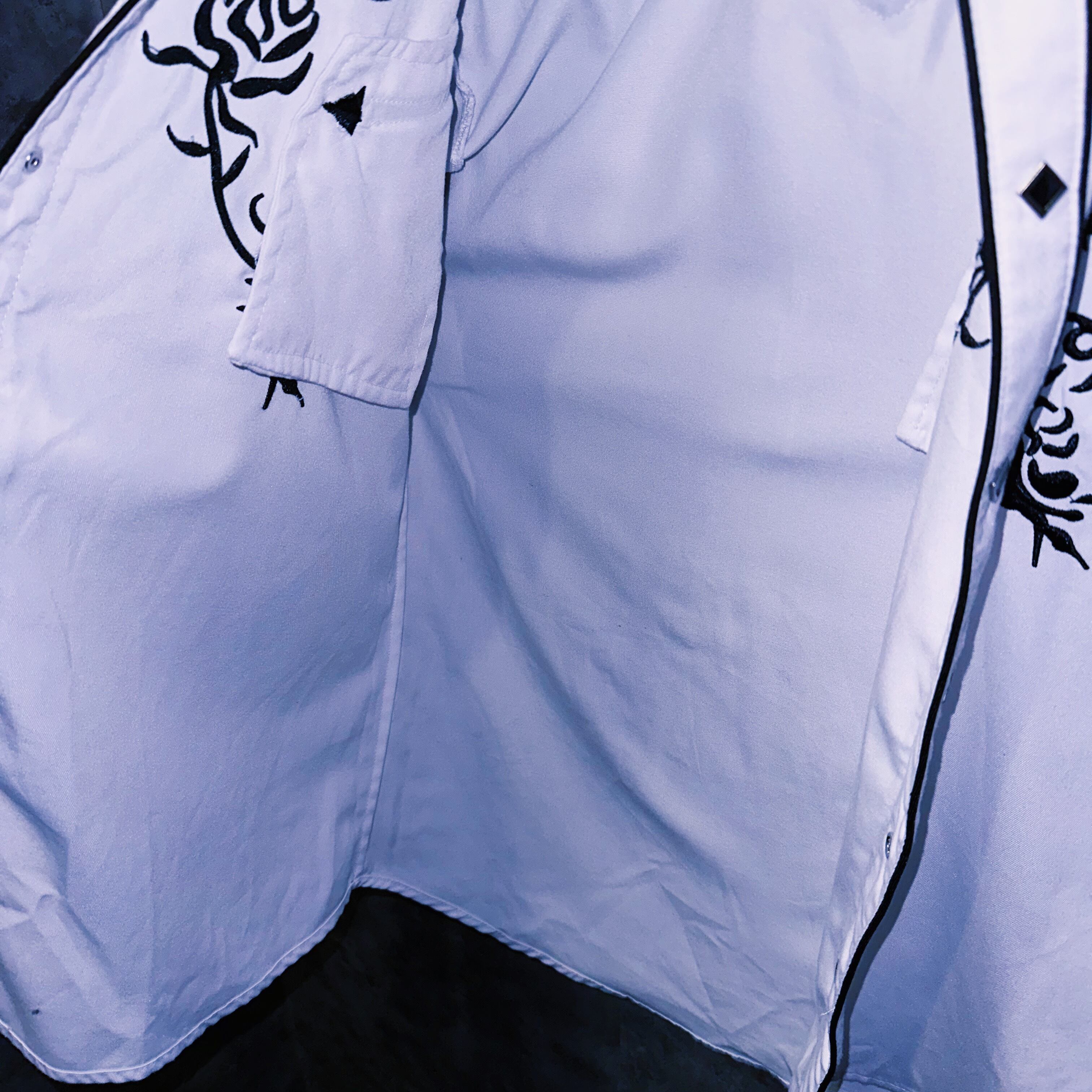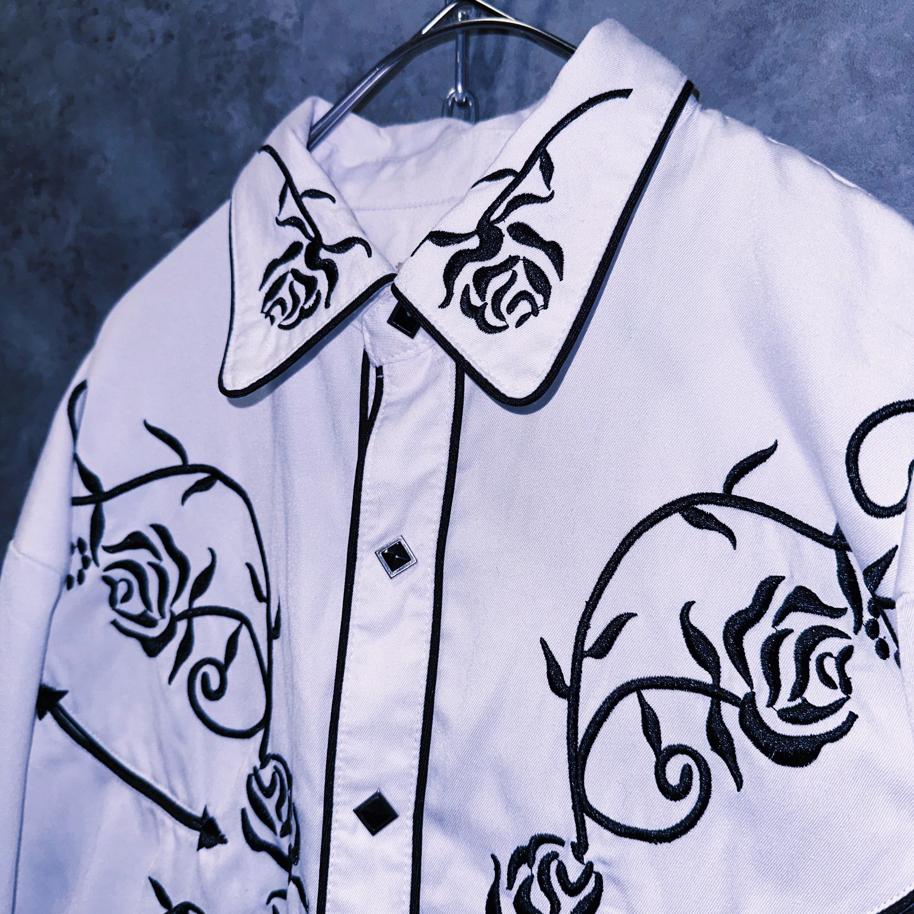 純潔のホワイトボディにフロント、バックと袖部分にはモノトーンカラーで輝く刺繍を刻んだラグジュアリー感溢れるウエスタンシャツ。