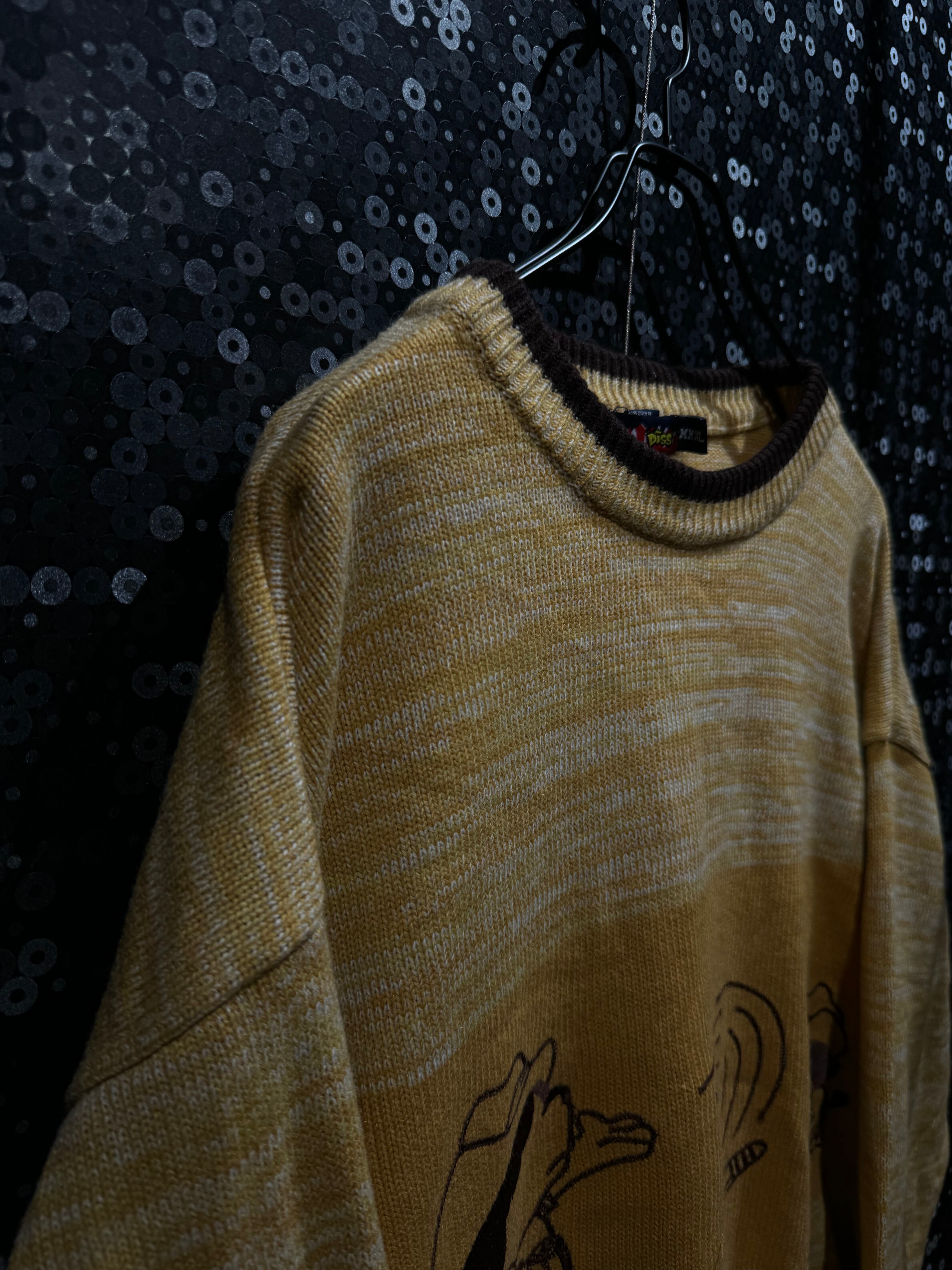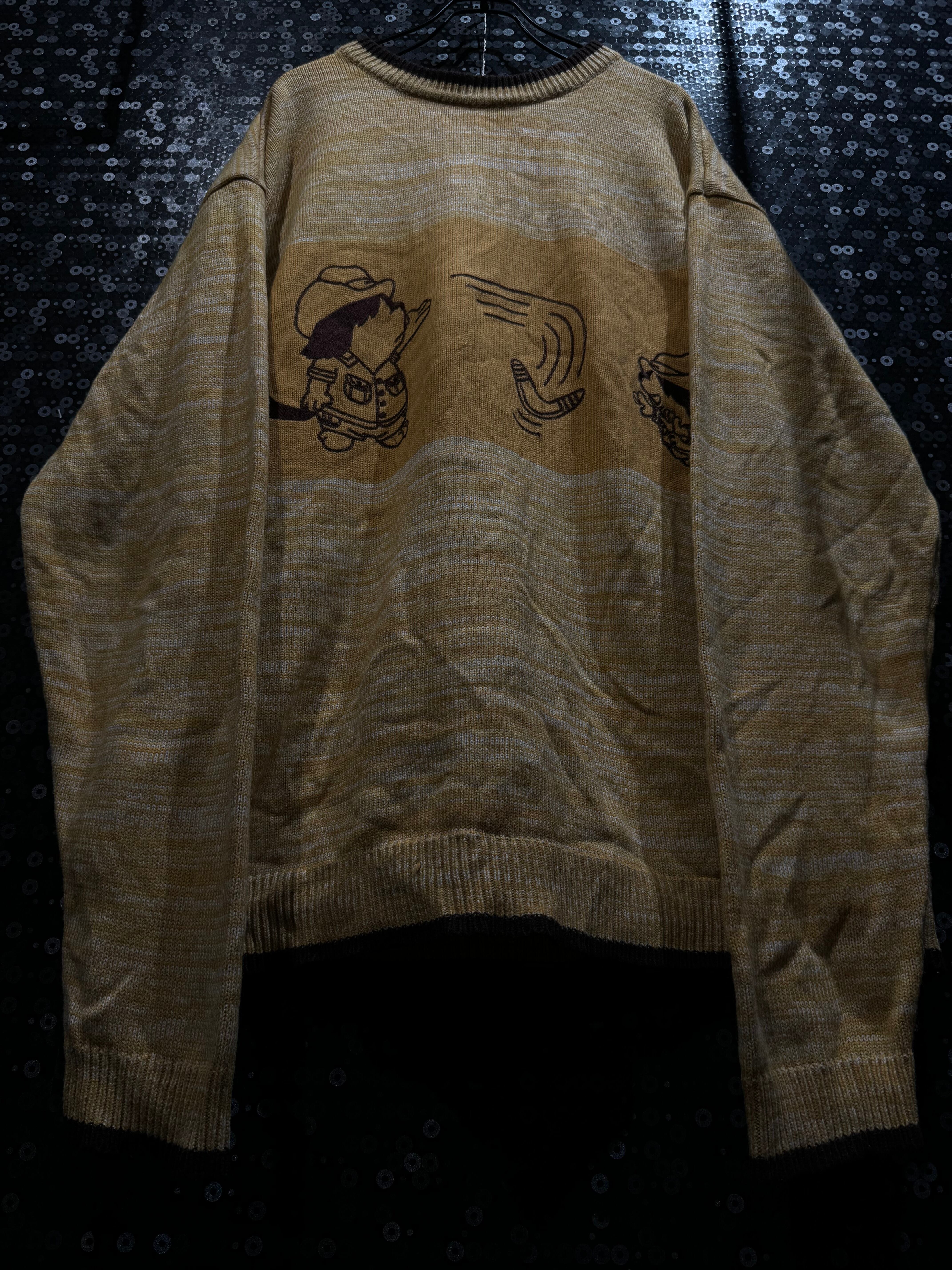 フロントには、ブーメランを投げるカウボーイスタイルのキャラクターが描かれたユニークなデザインが施されており、遊び心のあるディテールが魅力的です。