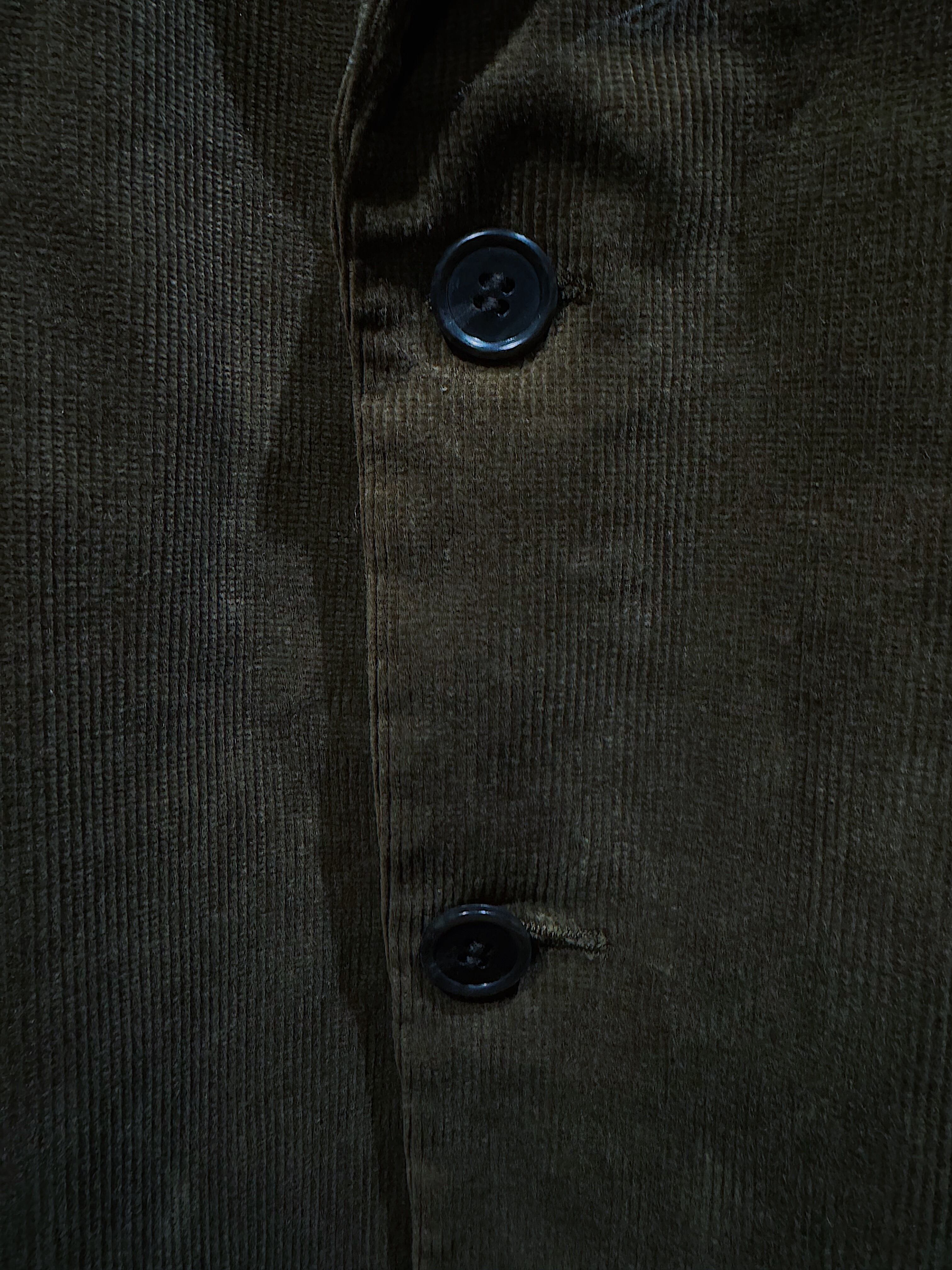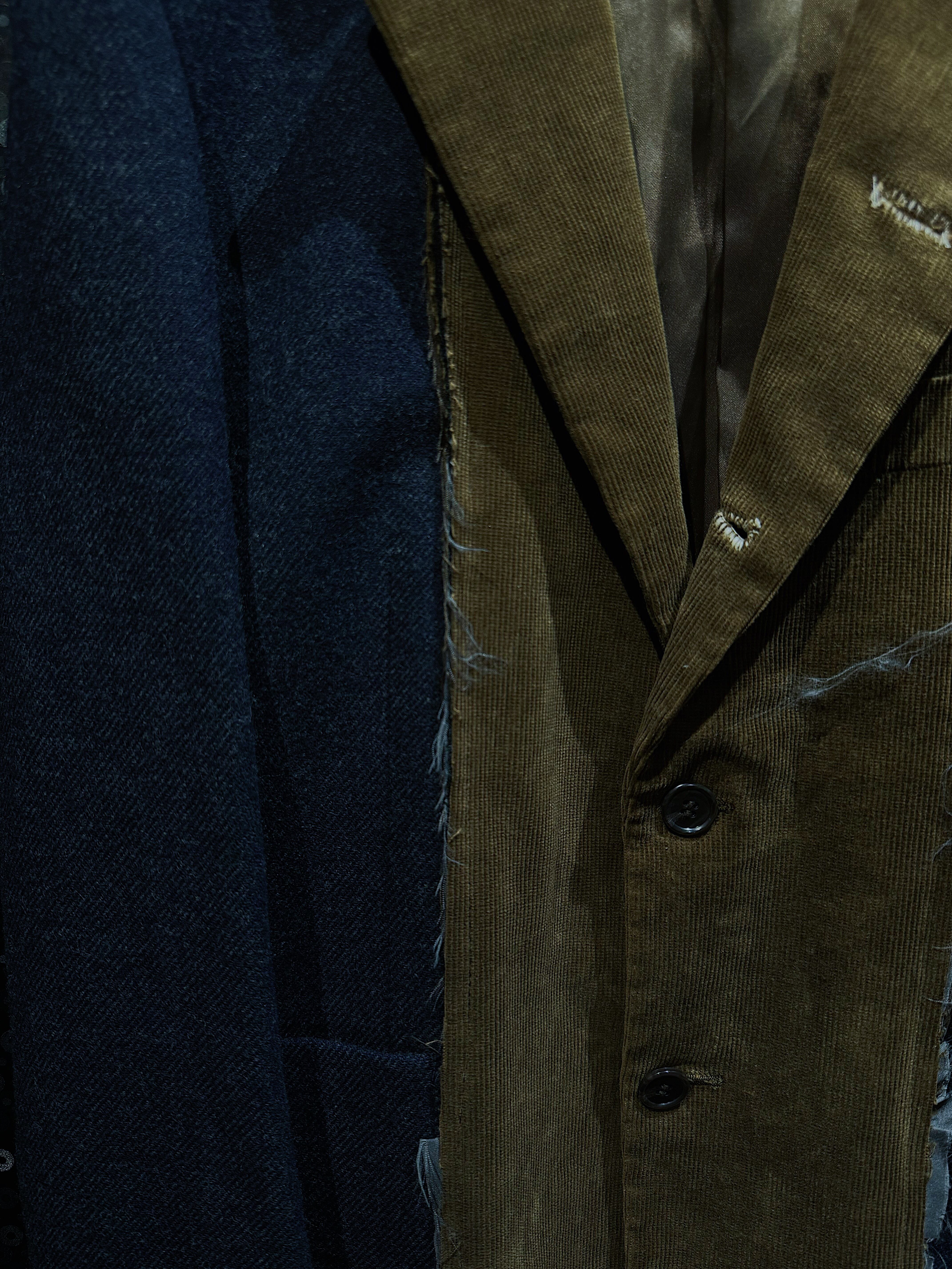 ベースにはクラシカルなウールブレンドのジャケットを使用し、フロント部分にヴィンテージ感のあるブラウンのコーデュロイ生地を組み合わせることで、異素材のコントラストを際立たせている。
