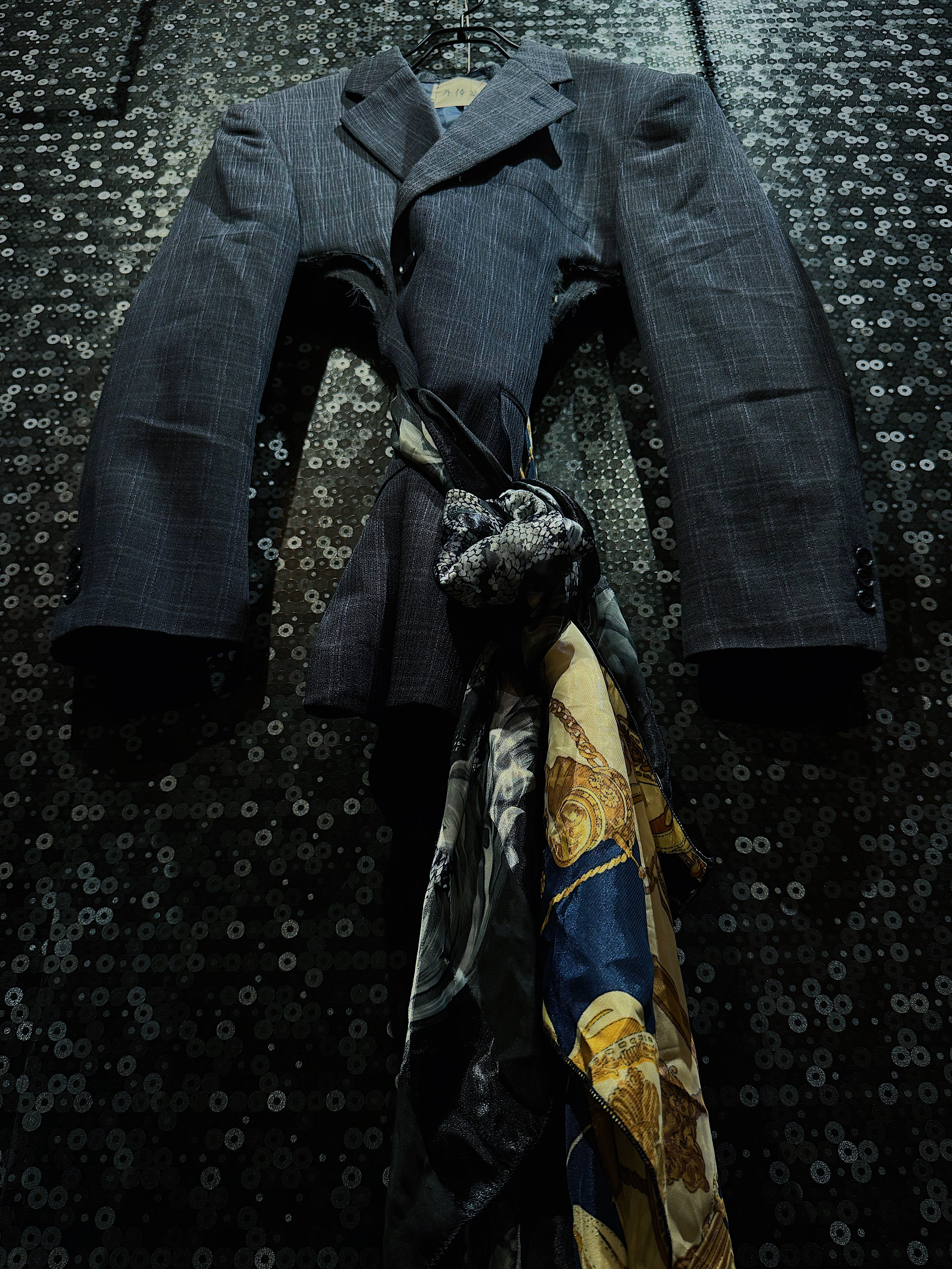この再倖築テーラードジャケットは、従来のジャケットデザインを大胆に再構築し、革新的なシルエットへと生まれ変わらせた一点もの。