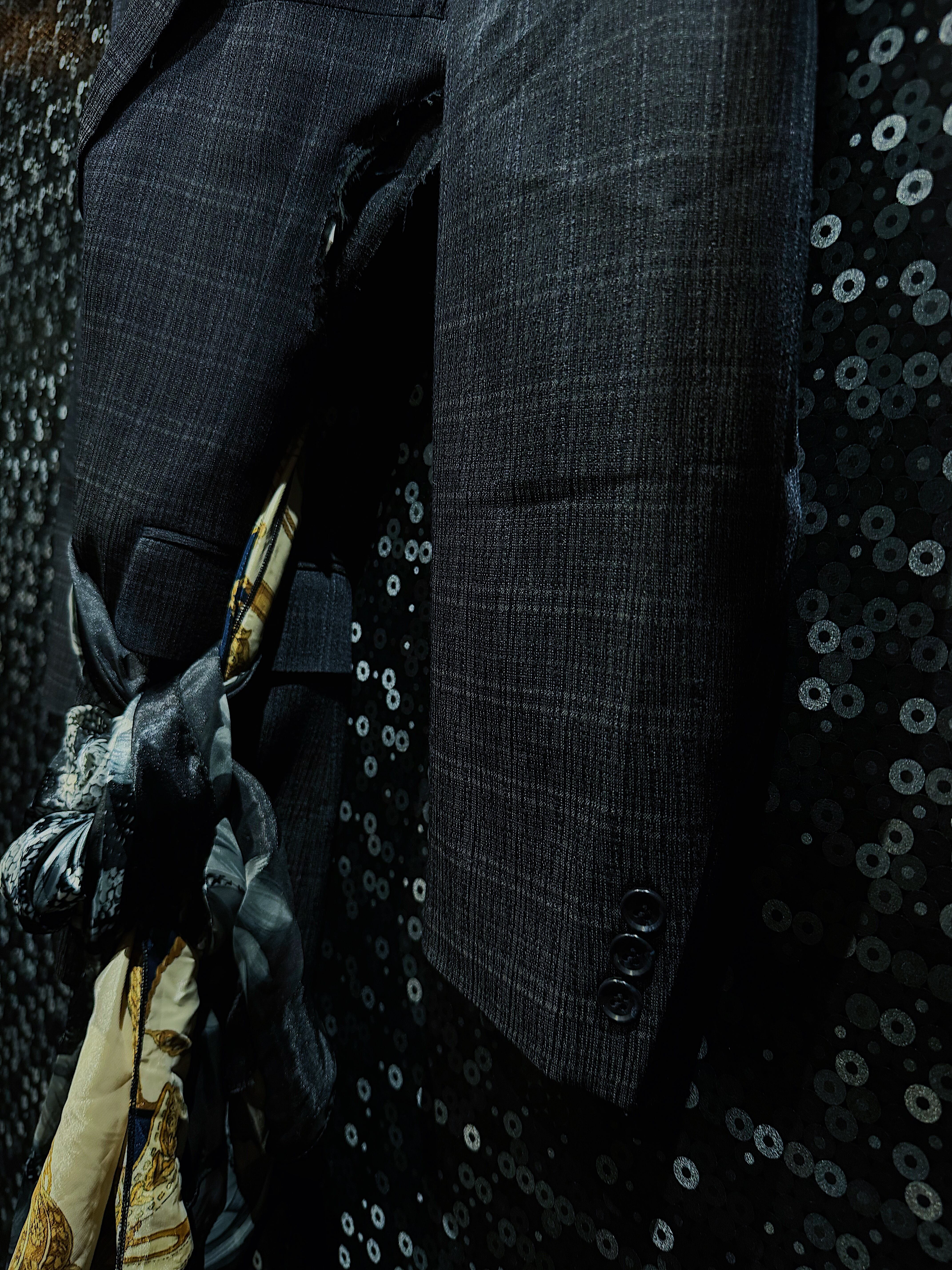 チェック柄のクラシカルなテーラードジャケットと、フリル生地の持つ動きのあるディテールが融合し、ストリートからモードスタイルまで幅広く対応するアイテムとなっています。
