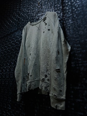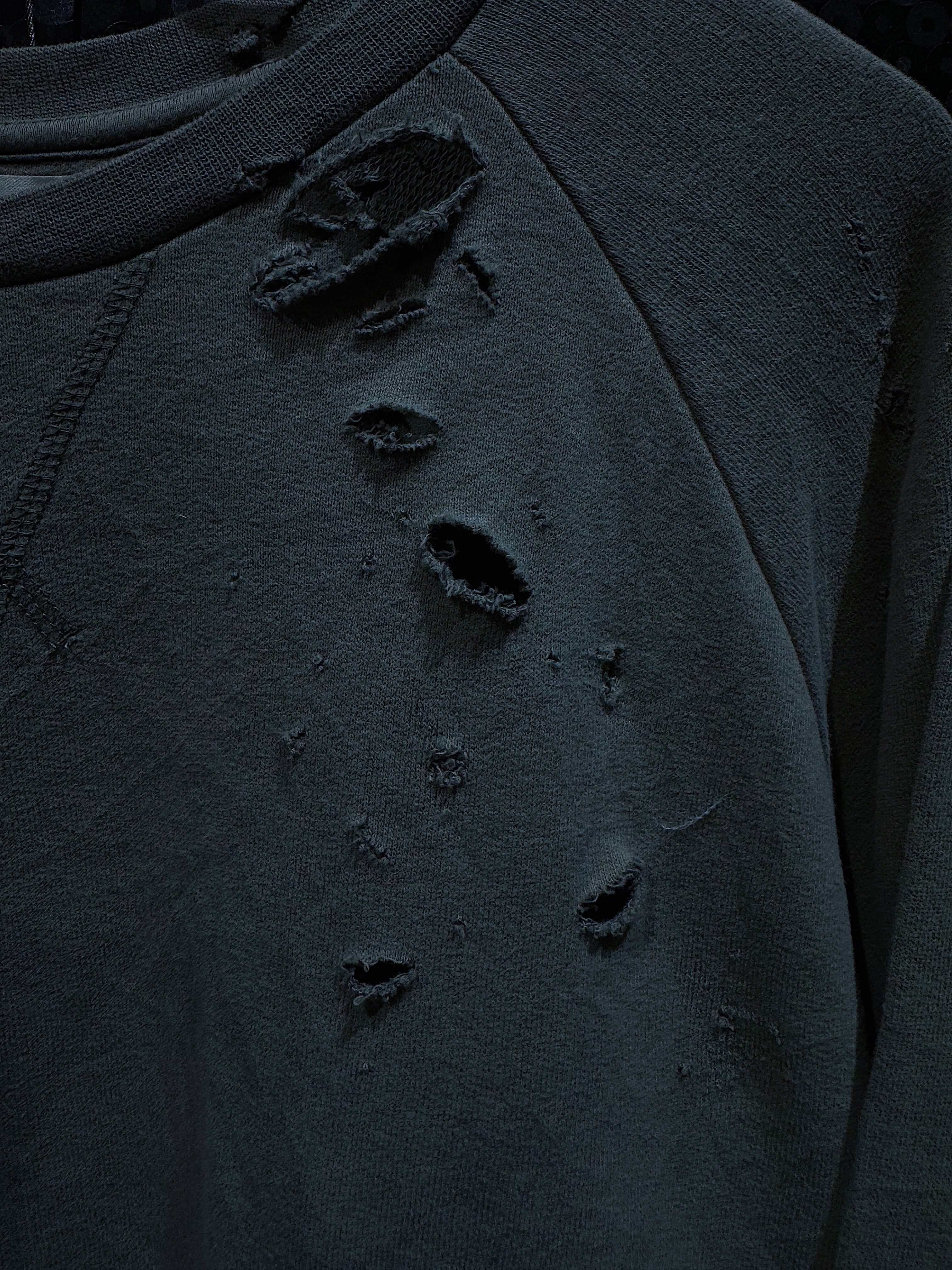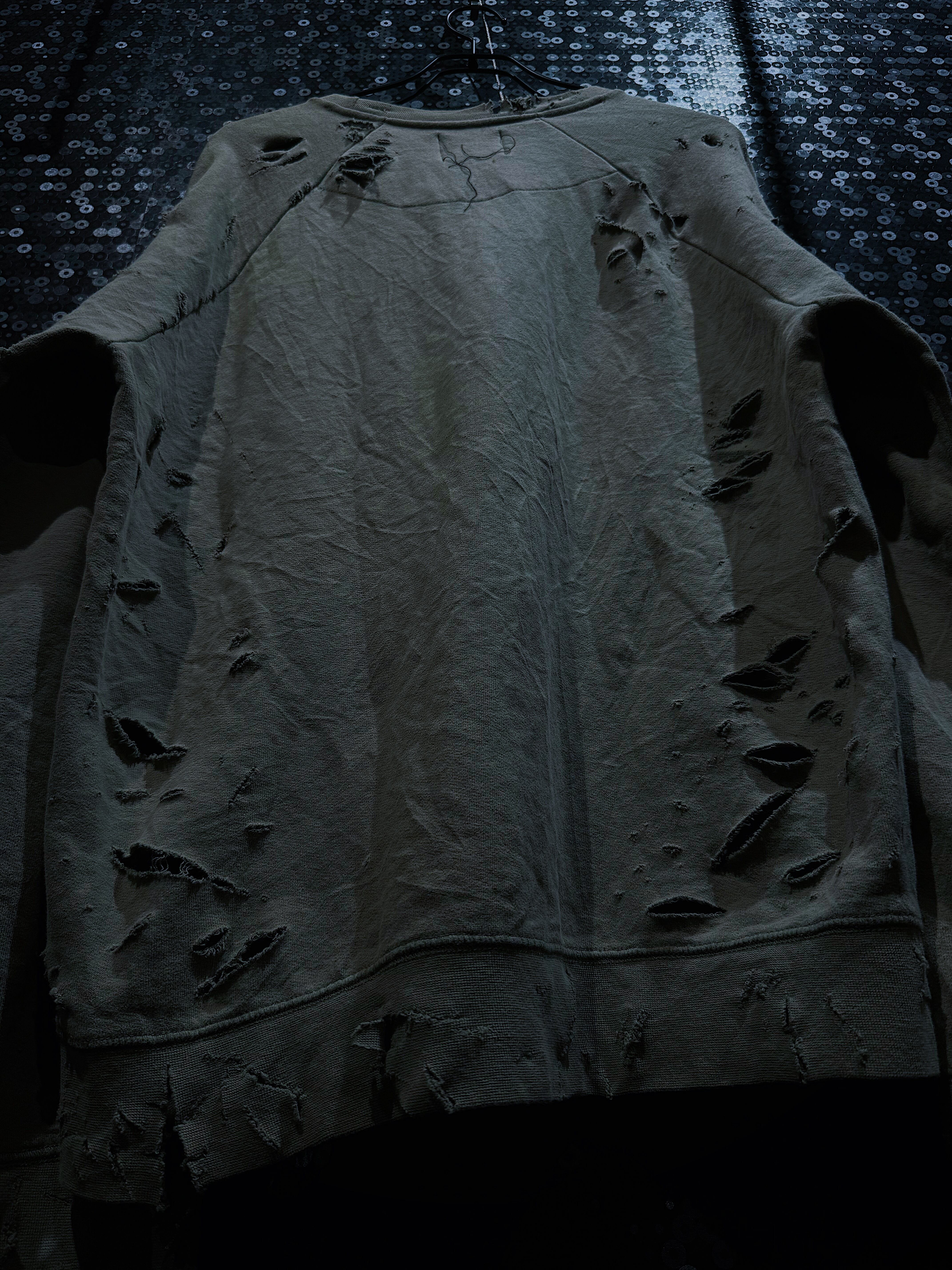ネックや袖口、裾部分には経年変化を感じさせるフリンジのようなほつれがあり、長年愛用されたかのような雰囲気を演出。さらに、全体的にシワ加工が施されており、ナチュラルな風合いとアート的なニュアンスが加わっています。ベースとなるスウェットは、柔らかなコットン素材で仕立てられ、着心地の良さも兼ね備えています。