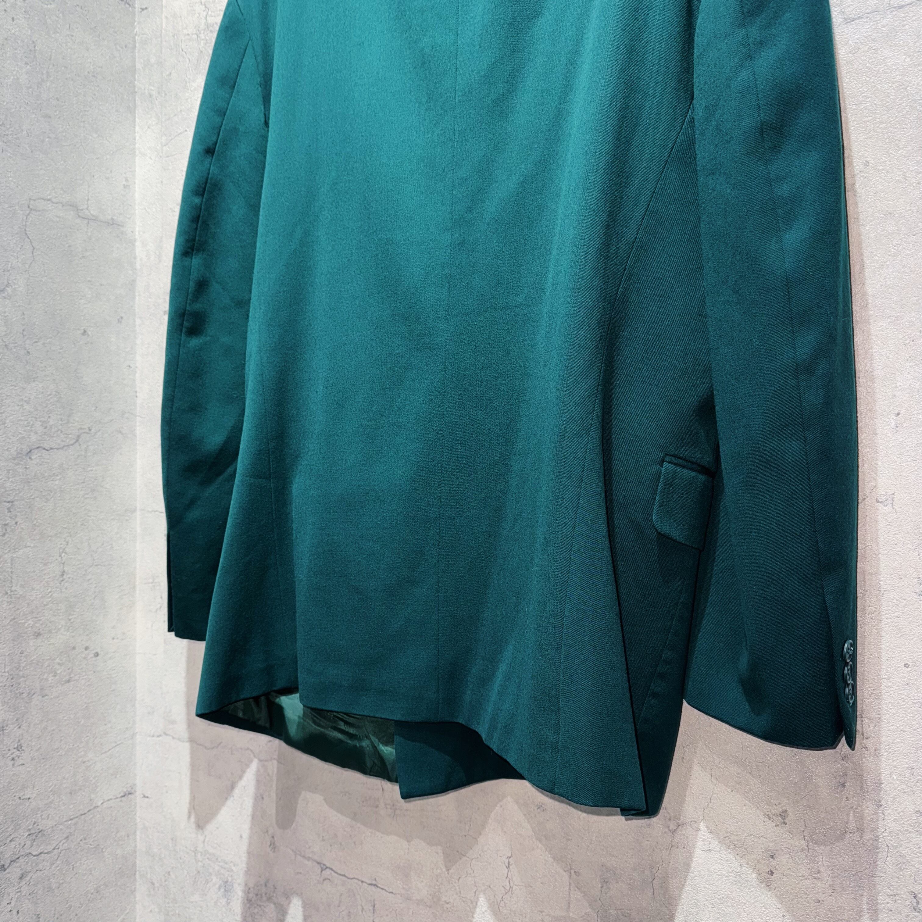 色鮮やかか青緑、テールグリーンを身に纏った圧巻の2ピース。他では中々お目にかかれないダブルに加え、ピークドラペル、パワーショルダーから生まれる立体的なジャケット。