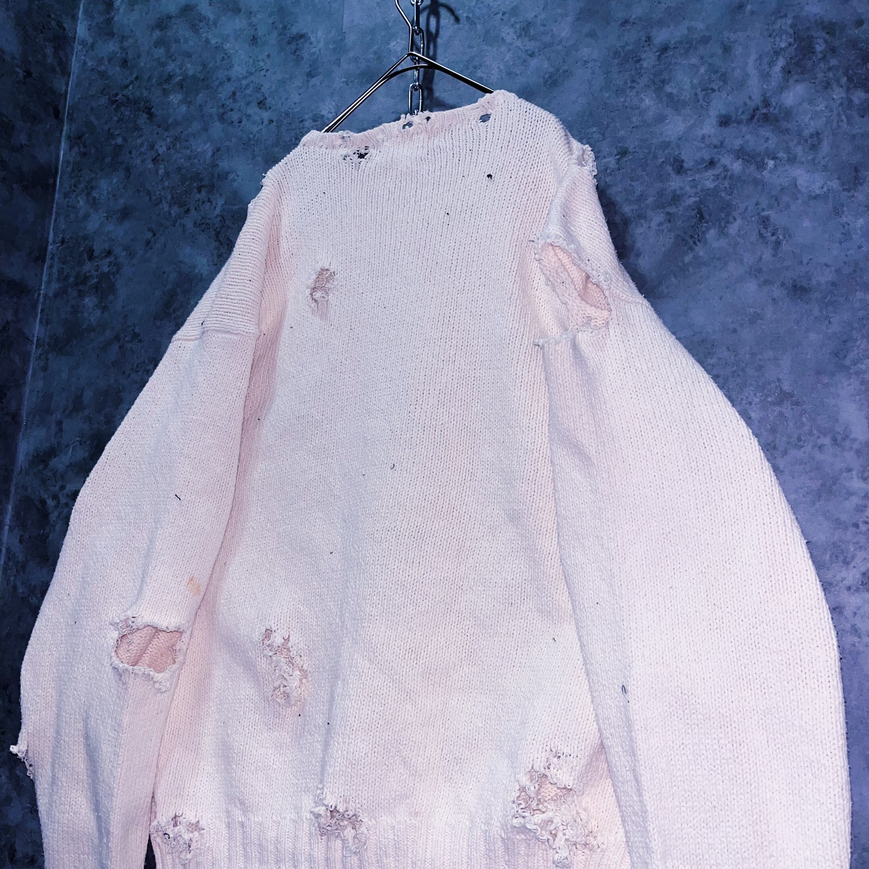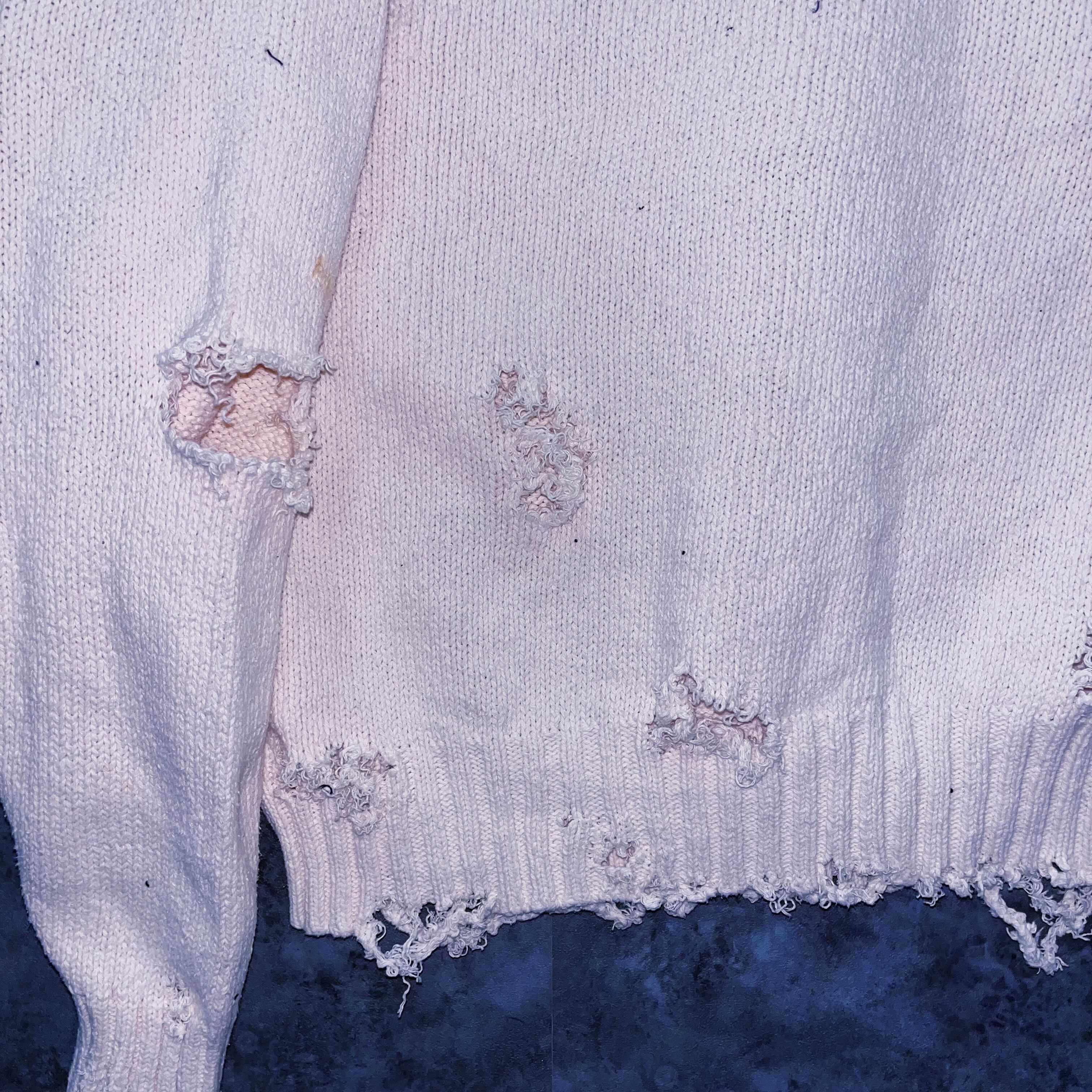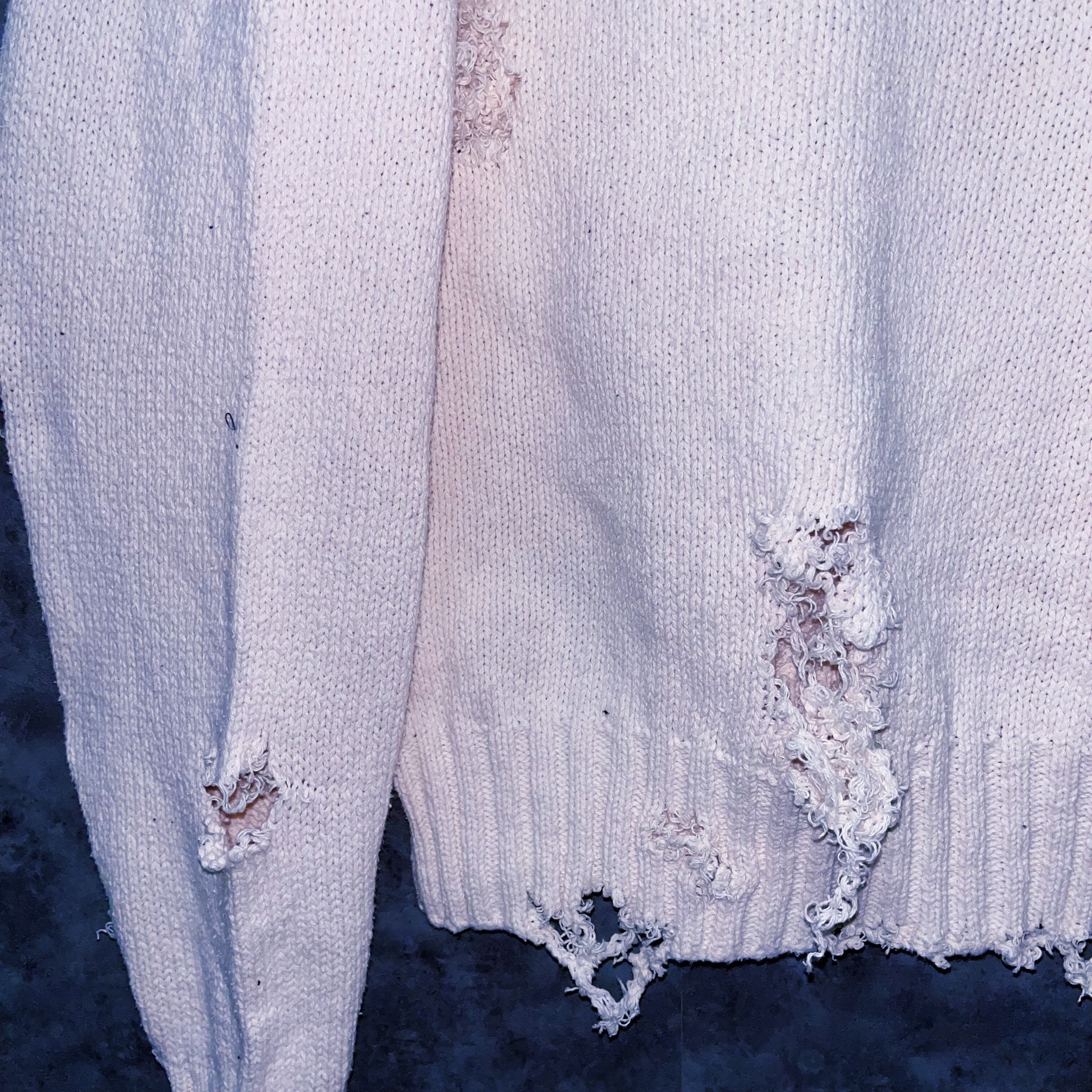 柔らかなホワイトカラーのポロのニットセーターを大胆にボロカスタムした一着。